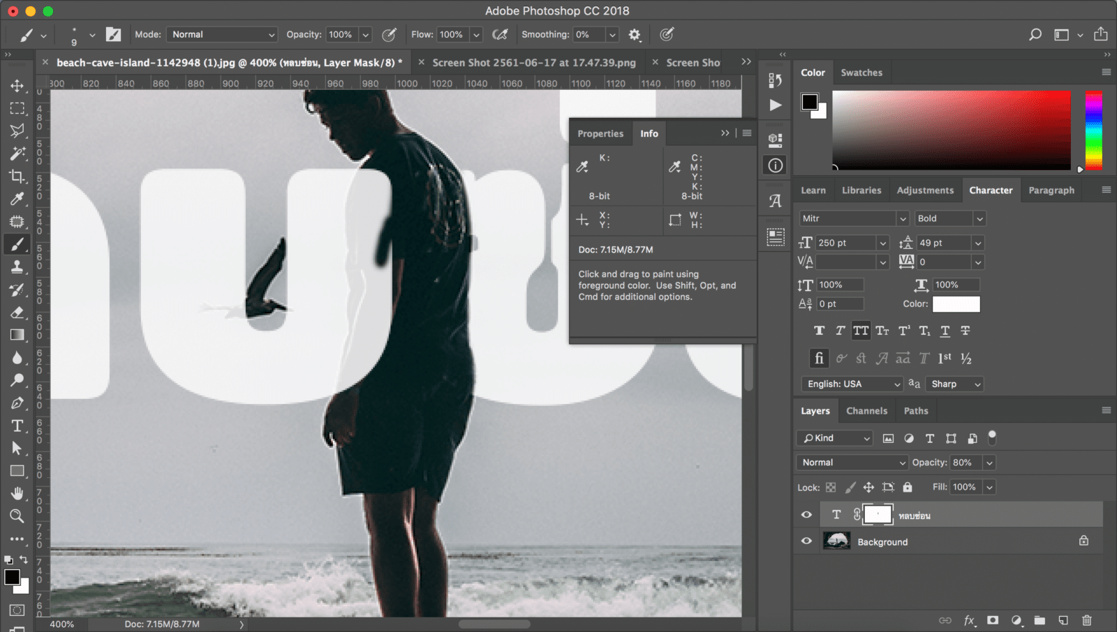 เลือกเครื่องมือ Brush Tools แล้วใช้สีดำค่อยๆแต้มลงไปในส่วนของตัวอักษรที่ไม่ต้องการออก สังเกตว่าตัวอักษรตอนนี้เหมือนกำลังถูกซ่อนไปข้างหลังภาพแล้ว ค่อยๆทำไปแบบไม่รีบร้อนกดซูม(Ctrl +) เข้าไปลบใกล้จะทำให้เนียนมากขึ้น