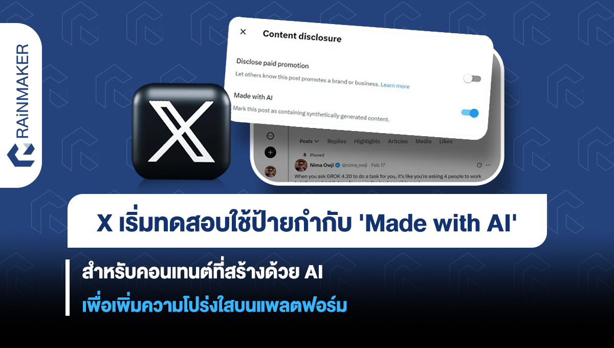 X เริ่มเดินหน้าทดสอบความปลอดภัยบนแพลตฟอร์มด้วยฟีเจอร์ใหม่ ที่มีเป้าหมายเพิ่มความโปร่งใสของคอนเทนต์ที่ถูกสร้างขึ้นโดย AI ซึ่งระบบจะทำการเพิ่มตัวเลือกให้ผู้ใช้สามารถทำป้ายกำกับ ‘Made with AI’ บนโพสต์ตัวเองได้ ว่าเป็นคอนเทนต์ที่สร้างขึ้นด้วย AI หรือไม่