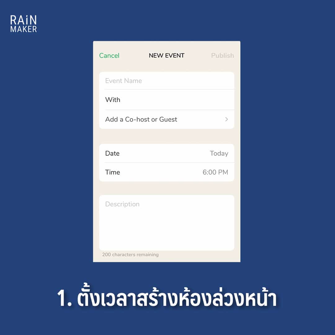การตั้งเวลาไว้ล่วงหน้า เป็นประโยชน์ต่อเรามากๆ เนื่องจากคนจะเห็นว่าเราจะจัดห้องตอนไหน และสามารถตั้งเตือนเพื่อเข้ามาฟังเราได้ในเวลานั้น นอกจากนี้การสร้างห้องไว้ก่อนยังทำให้สามารถนำลิงก์ไปแชร์ต่อในช่องทางอื่นเพื่อเชิญชวนให้คนเข้ามาดูต่อได้อย่างสะดวกมากขึ้นอีกด้วย