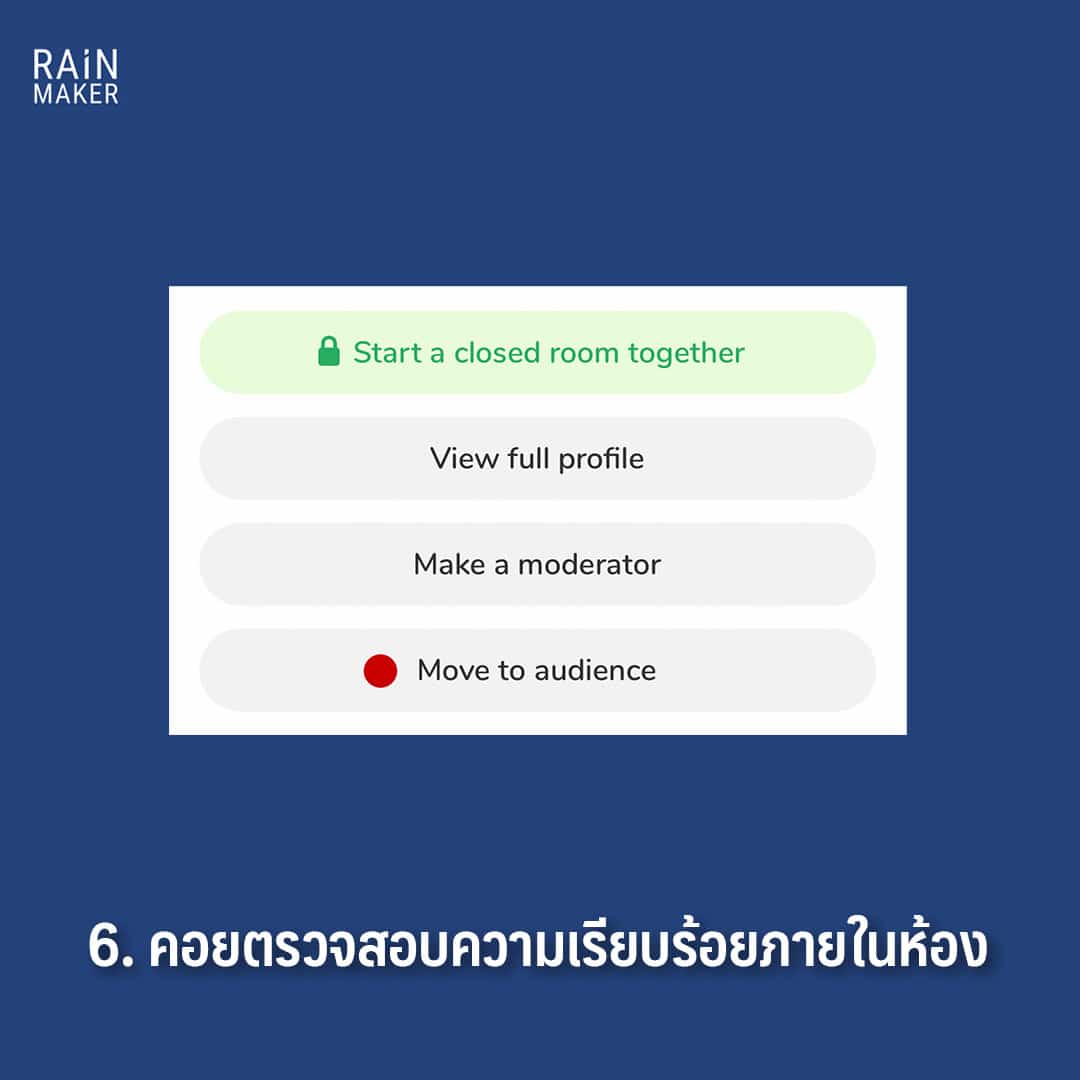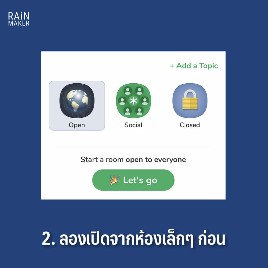 หากกลัวว่าการเปิดห้องจะไม่ประสบความสำเร็จ ให้ลองสร้างจากห้องเล็กๆ เช่น ห้อง Closed หรือ Social ก่อนก็ได้ เพื่อพูดคุยเฉพาะกับคนที่เชิญหรือคนที่ฟอลโลว์ เป็นการฝึกในการจัดการกับห้องดูก่อน ทั้งในแง่ของฟังก์ชันต่างๆ และทักษะในการพูดคุยของเราเอง จากนั้นคอยเปิดห้องเป็นสาธารณะก็ได้