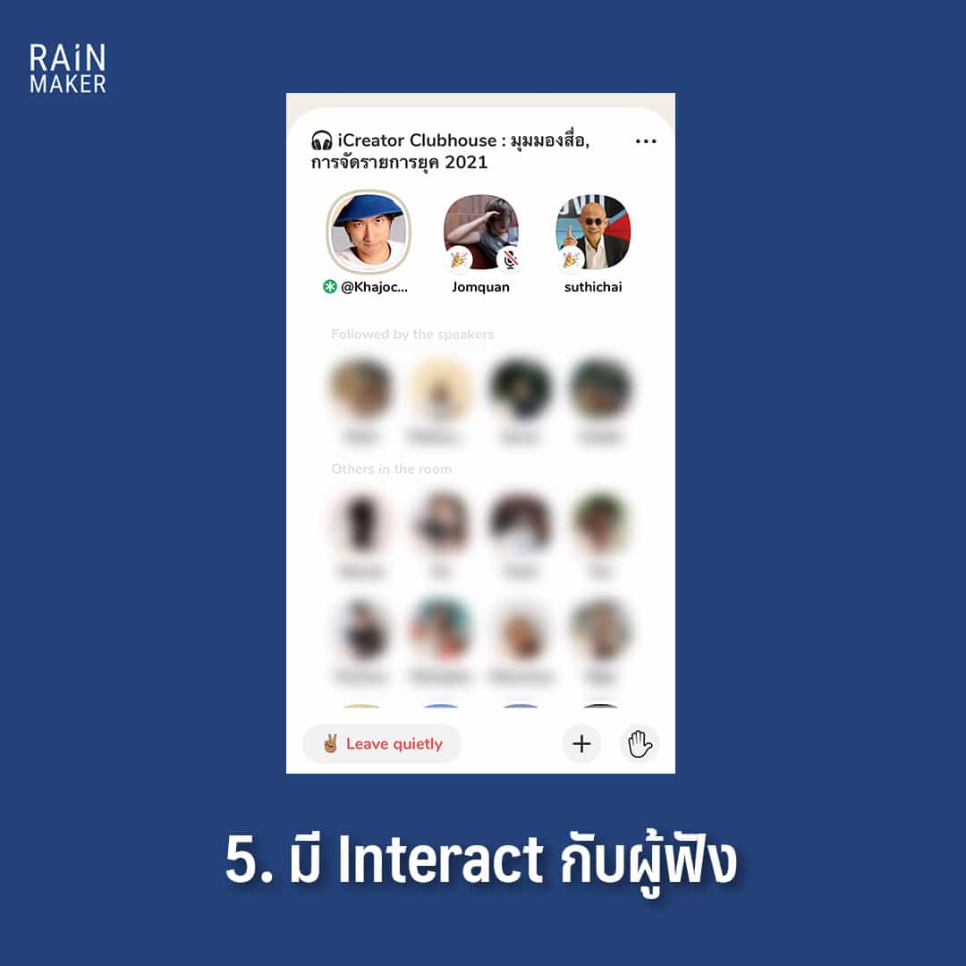 จุดเด่นของคลับเฮาส์คือเปิดโอกาสให้ผู้คนได้พูดคุยกัน เป็นไปได้ควรพยายามหาโอกาสให้ผู้ฟังสามารถมีส่วนร่วมให้มากที่สุด ไม่ว่าจะเป็นการเปิดให้ผู้ฟังขึ้นมาแชร์ประสบการณ์ หรือตอบคำถาม Q&A