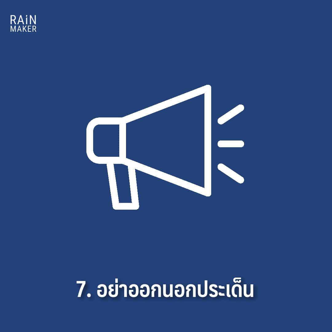 ถ้ามีวัตถุประสงค์ของห้องอย่างชัดเจนแล้ว ก็ไม่ควรที่จะออกนอกประเด็นไปไกล อาจจะมีประเด็นเสริมได้แต่ต้องรีบกลับเข้าประเด็นเพื่อไม่เป็นการเสียเวลา เพราะบางคนเข้าห้องมาเพื่อต้องการรับประโยชน์ตามชื่อห้องที่ตั้ง หรือหากหมดเวลาแล้วอยากเปิดห้องเพื่อพูดคุยเพิ่มเติม ก็ควรแจ้งทุกคนในห้องก่อนว่าเนื้อหาหลักของห้องจบแล้ว ต่อจากนี้คือการพูดคุยที่แล้วแต่ความสะดวกของแต่ละคน เพื่อเป็นตัวเลือกการตัดสินใจในการออกจากห้องของผู้ฟัง