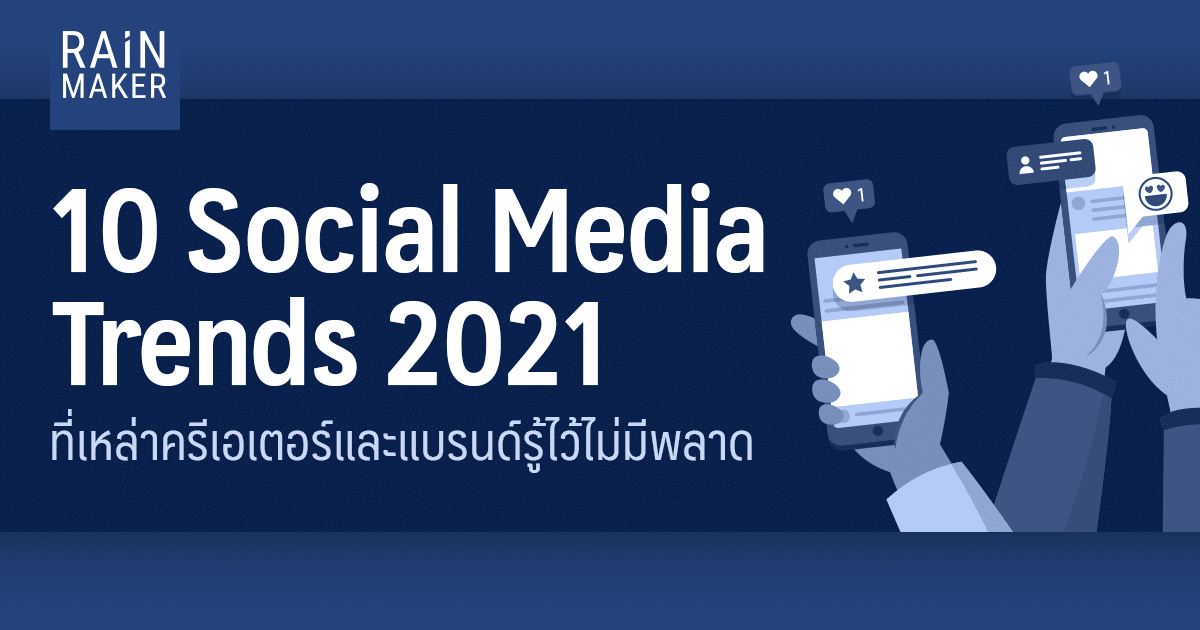 โควิด-19 ทำให้หลายๆ อย่างเปลี่ยนไป รวมถึงบนโลกโซเชียลมีเดียก็เช่นกัน ในช่วงปีที่ผ่านมาพบว่าคนเล่นโซเชียลมีเดียเพิ่มมากขึ้น และโซเชียลมีเดียได้เข้ามามีบทบาทในการใช้ชีวิตประจำวันมากขึ้นอีกด้วย ส่งผลให้เกิดการเปลี่ยนแปลงด้านพฤติกรรมการใช้งานในหลายๆ ด้านวันนี้ RAiNMaker เลยสรุป 10 Social Media Trends ประจำปี 2021 ไว้ให้เหล่าครีเอเตอร์และแบรนด์ได้ศึกษา เตรียมพร้อม และนำไปปรับใช้ในการสื่อสารหรือการทำการตลาดกันค่ะ