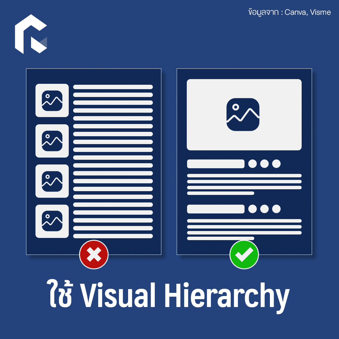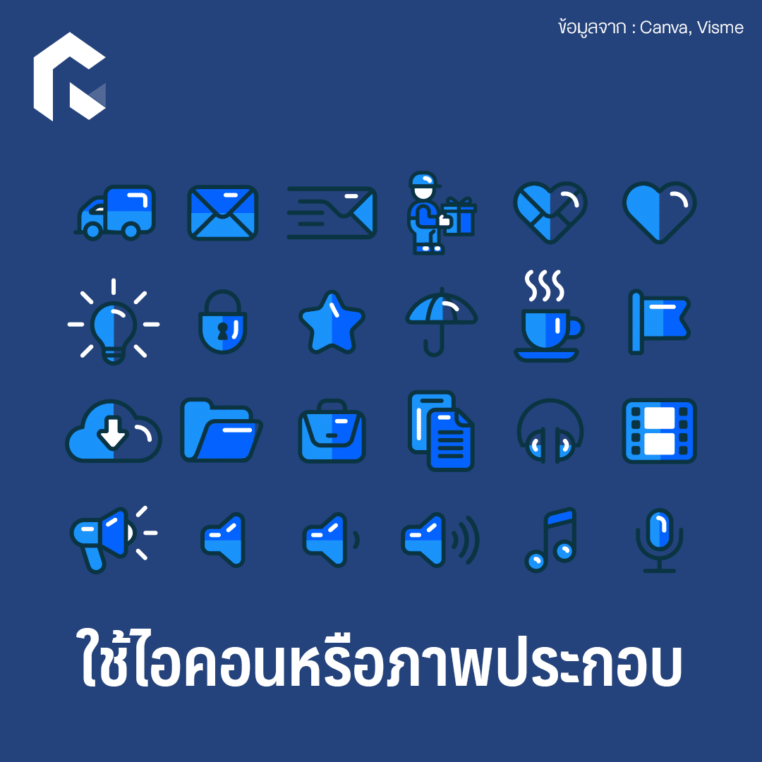 การใช้ภาพเล่าหรือใช้สัญลักษณ์ต่าง ๆ แทนจะช่วยให้เข้าใจง่ายขึ้น ไม่ว่าจะเป็นไอคอน กราฟ หรือภาพประกอบ เป็นต้น เพื่อช่วยในการลดตัวหนังสือ ลดความซับซ้อน แถมยังช่วยดึงดูด เมื่อคนเห็นปุ๊บก็เข้าใจปั๊บโดยที่ไม่ต้องอธิบายเป็นตัวหนังสือ
