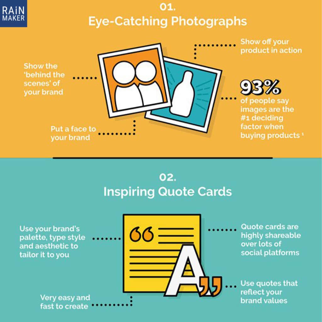 ภาพที่นำมาใช้ประกอบคอนเทนต์ ควรเป็นภาพที่ไม่ซ้ำใครและต้องแสดงความเป็นเอกลักษณ์ของแบรนด์ เพื่อสร้างความแตกต่างและยังจดจำได้ง่ายอีกด้วย 67% ของผู้บริโภคบอกว่า พวกเขาจะสนใจแบรนด์มากขึ้น