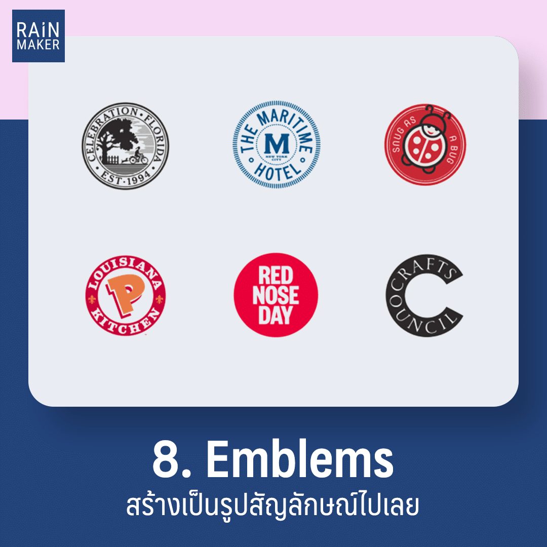 ไปให้สุดแล้วหยุดที่โลโก้แบบ “ตราสัญลักษณ์” เหมาะสำหรับใครที่มีข้อมูลเยอะ และอยากใส่ข้อมูลเหล่านั้นทั้งหมดลงไปในโลโก้ เช่น วันก่อตั้ง รูปภาพ คำสร้อยต่างๆ ต้องจัดเลยค่ะ