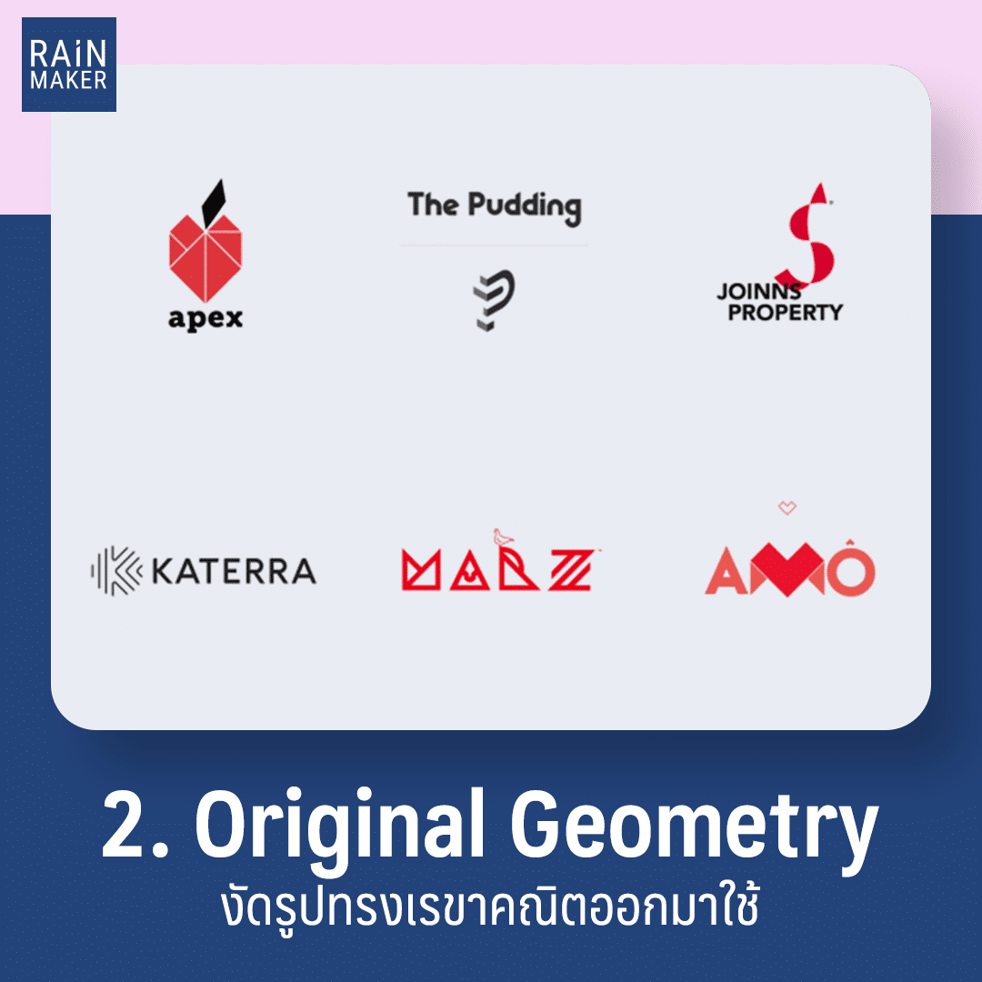 เป็นการนำรูปทรงเรขาคณิตมาดัดแปลงเป็นตัวอักษร แน่นอนว่าโลโก้แบบนี้ไม่มีทางเหมือนใครแน่นอน เพราะเป็นการเลือกแบบและจัดวางโดยตัวเรา ใครที่ต้องการความต่าง แนะนำเลยค่ะ