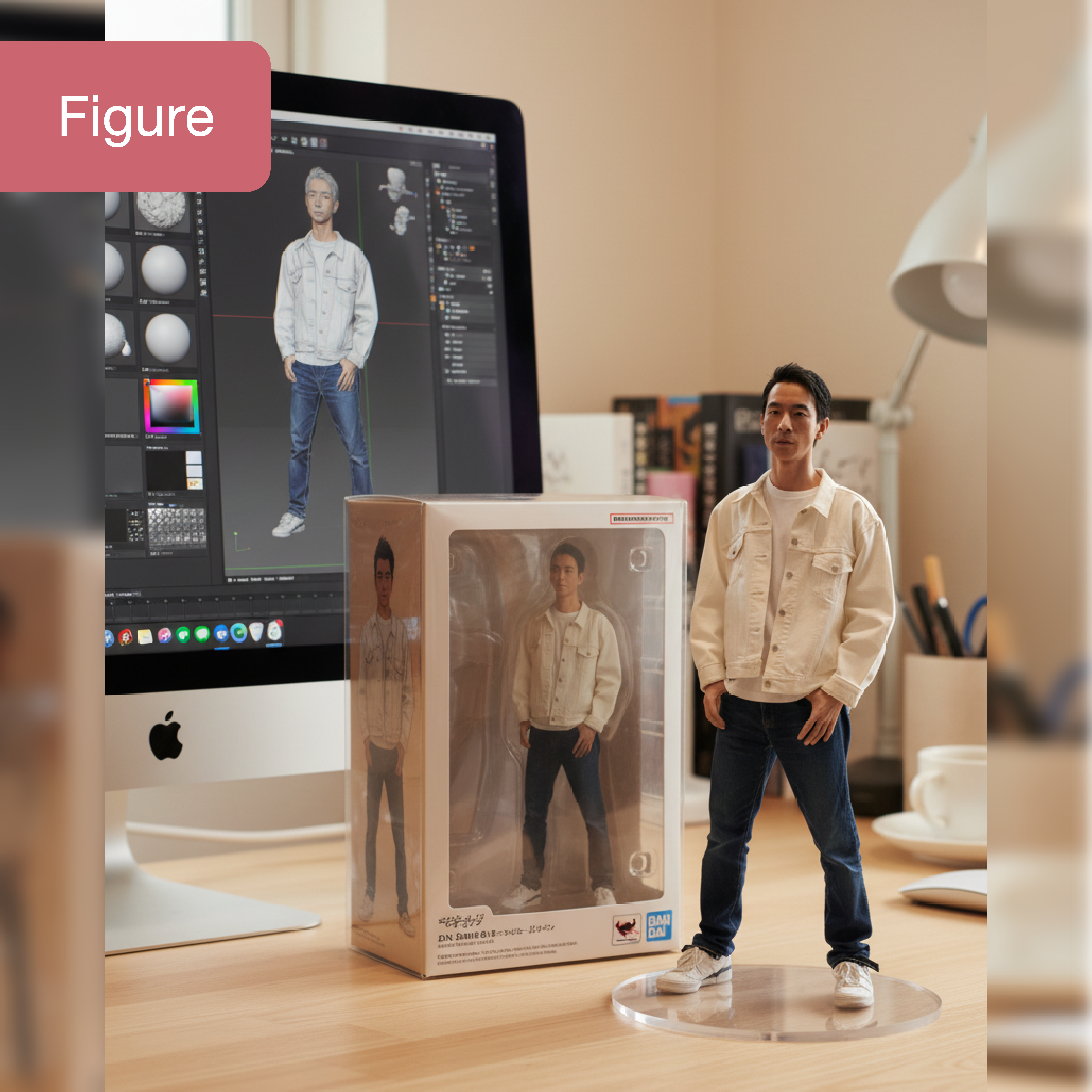 Using the model, create a highly realistic 1/7 scale commercialized figurine of the characters in the picture, rendered in a realistic style and placed in a real environment. The figurine should be displayed on an iMac desk in a clear and cozy room. It has a round, transparent acrylic base with no text on it. On the computer screen, show the ZBrush modeling process of this figurine. Next to the screen, place a BANDAI-style toy packaging box printed with the original artwork and enclosed in a plastic toy box, featuring two-dimensional flat illustrations.