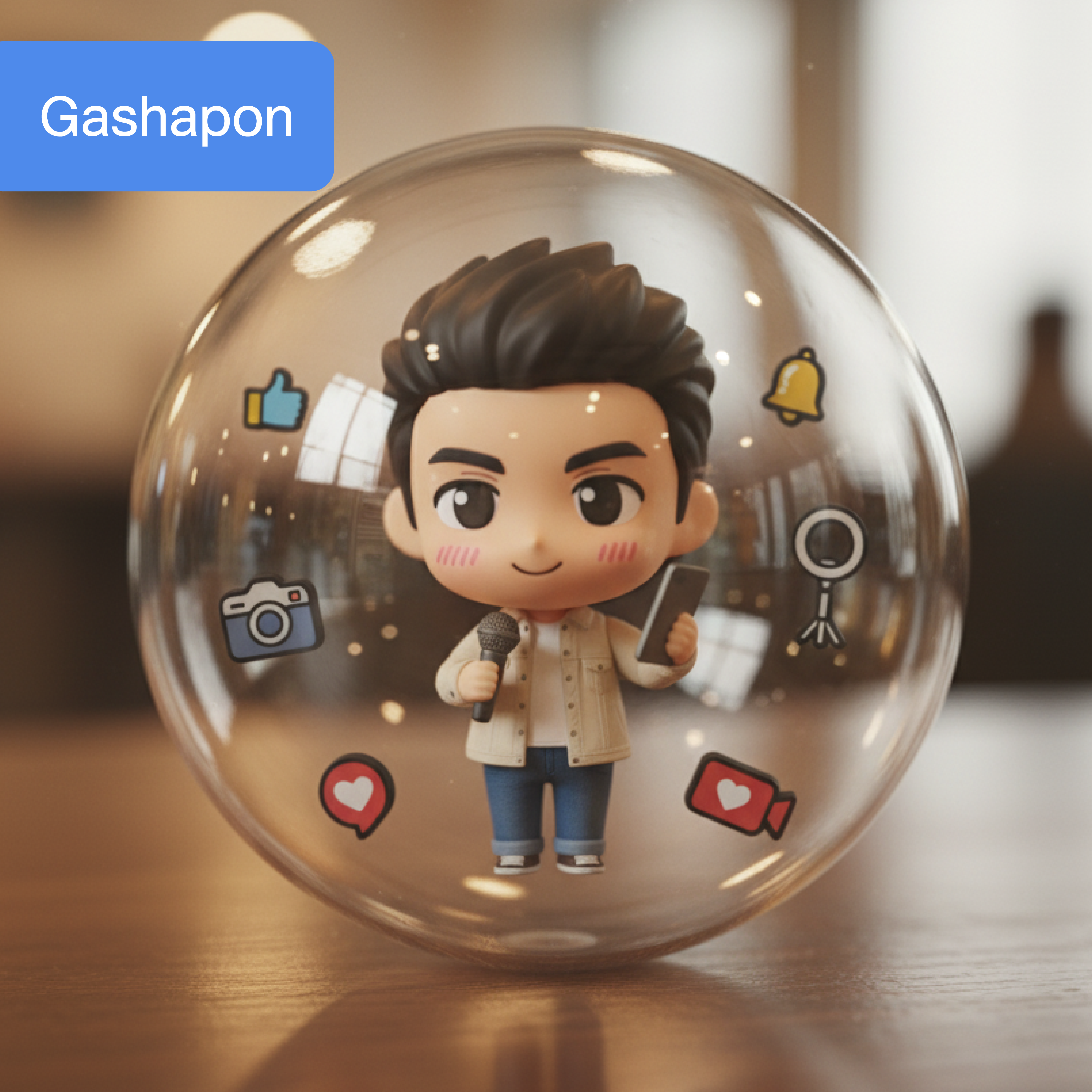 Inside the capsule is a chibi-style, full-body miniature of the person from the uploaded photo, enclosed in a clear, glossy, realistic gashapon capsule with subtle reflections and refractions.
