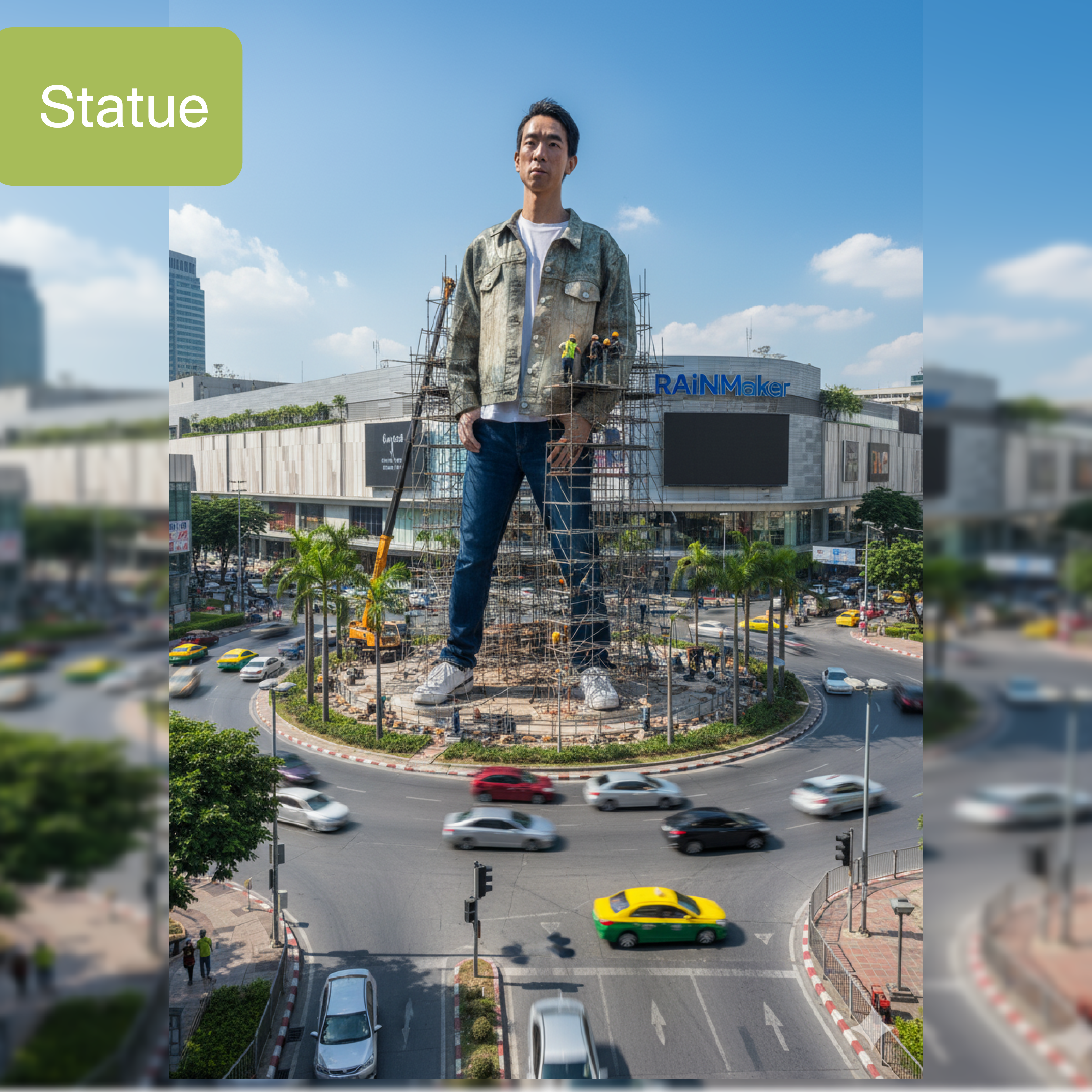 Create a large-scale statue of the person in the uploaded photo, keeping their appearance exactly the same (100% likeness). The statue is located in the middle of [Phranakorn, Bangkok]. Adjust the skin tone to match the lighting, with realistic colors. Several construction workers are helping build the statue on tall scaffolding, with construction vehicles nearby. The roundabout has traffic with cars moving around. The weather is clear and sunny. Capture the scene as a professional DSLR full-frame photograph. Include a shopping mall with the sign [RAiNMaker] and trees in the roundabout.