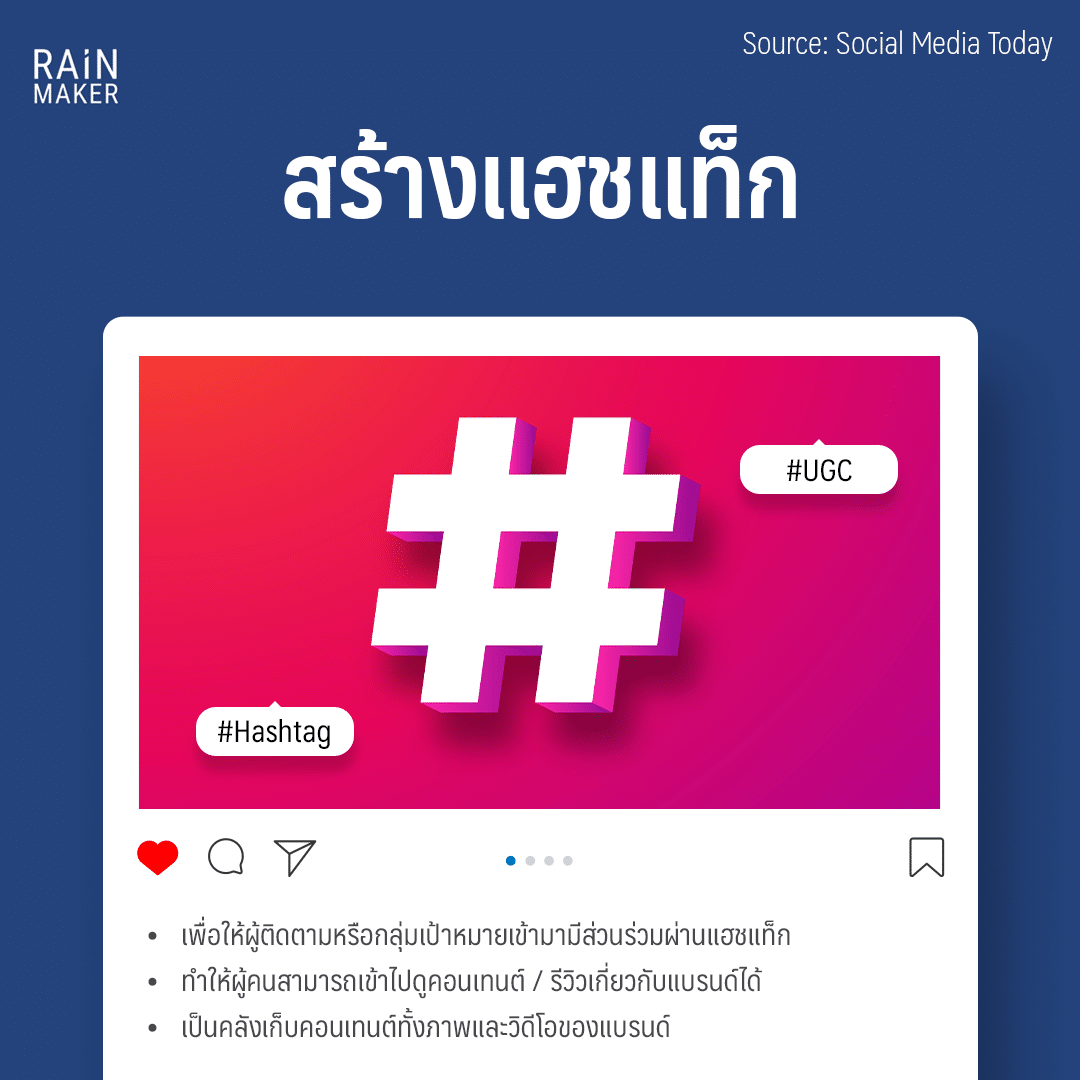 อย่างแรก! สิ่งที่ง่ายที่สุดก็คือสร้างแฮชแท็กของแบรนด์ขึ้นมา เพื่อให้ผู้ติดตามหรือกลุ่มเป้าหมายเข้ามามีส่วนร่วมในการติดแฮชแท็ก นอกจากนี้การสร้างแฮชแท็กยังทำให้แบรนด์สามารถเข้าไปดูคอนเทนต์ทั้งหมดของผู้ที่เข้ามามีส่วนร่วมได้อย่างง่ายดายมากขึ้นอีกด้วย ทำให้เห็นภาพรวมว่ามีคนสนใจและมีส่วนร่วมกับแบรนด์มากน้อยเพียงใด แถมแฮชแท็กยังเป็นเหมือนคลับเก็บคอนเทนต์ทั้งภาพ และวิดีโอไว้ให้ผู้คนกลับมาดูรีวิว นอกจากนี้แบรนด์สามารถนำไปใช้ประโยชน์ต่อได้อีก ตามข้อที่กำลังจะพูดต่อไปนี้
