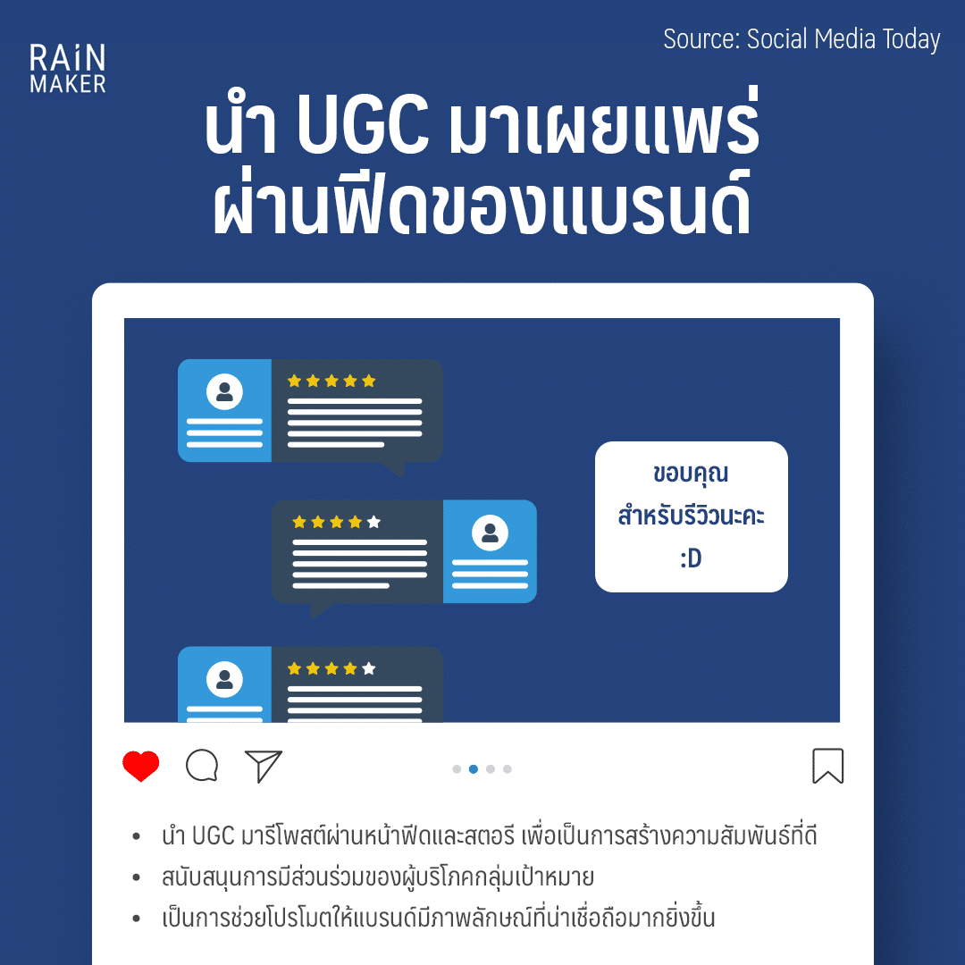วันนี้ RAiNMaker ได้หยิบทิปส์เล็กๆ น้อยๆ 4 ข้อ ในการใช้ประโยชน์อย่างมีประสิทธิภาพจากคอนเทนต์ UGC บนอินสตาแกรมมาฝากสำหรับแบรนด์มาฝากกันค่ะ บอกเลยไม่ยาก ทั้งแบรนด์ได้โปรโมต เพิ่มยอด engagement แถมผู้บริโภคกลุ่มเป้าหมายเองก็ได้มีส่วนร่วมกับแบรนด์ และคนทั่วไปที่เข้ามาศึกษารีวิวก็ได้ข้อมูลอีกต่างหาก เรียกได้ว่าวินวินกันทุกฝ่าย