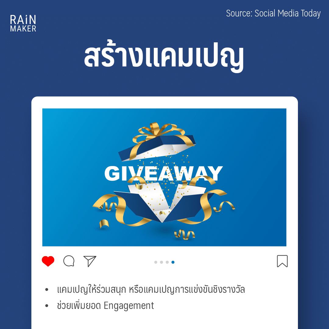 การสร้างแคมเปญให้ผู้คนเข้ามาร่วมสนุก หรือร่วมแข่งขันเพื่อชิงรางวัลจากแบรนด์ เป็นสิ่งที่จะช่วยเพิ่มยอด engagement ให้แบรนด์ได้เป็นอย่างดี โดยบนอินสตาแกรมก็เป็นแพลตฟอร์มที่เหมาะในการจัดแคมเปญ เช่น การถ่านภาพหรือวิดีโอเชิงสร้างสรรค์ เนื่องจากสามารถลงคอนเทนต์ได้ทั้งภาพและวิดีโอ แถมยังมีฟีเจอร์ให้เลือกมากมายไม่ว่าจะเป็น Stories, IGTV หรือ Reels ให้ได้สร้างสรรค์คอนเทนต์กันได้แบบไม่จำกัดขอบเขต