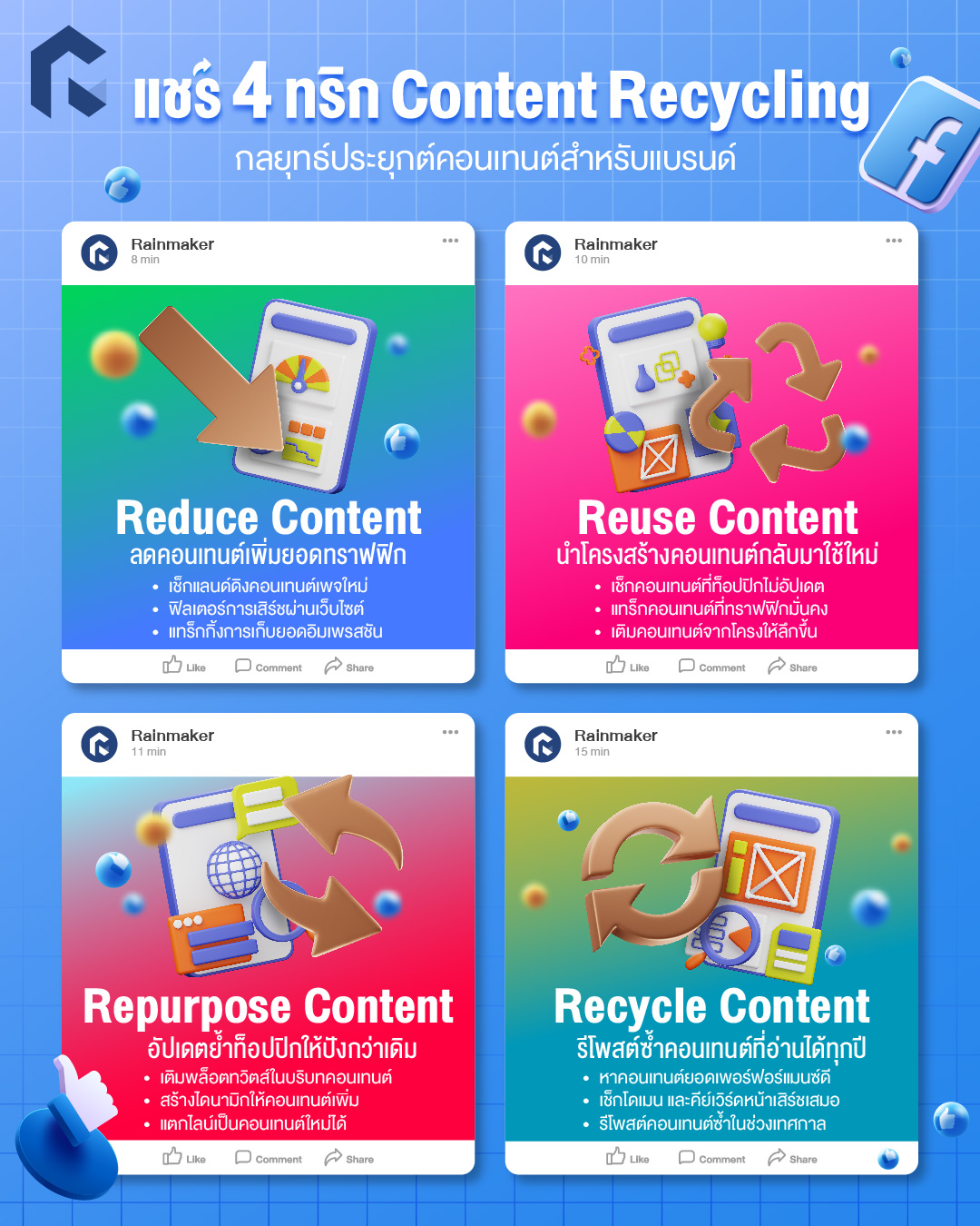 การมรคอนเทนต์สดใหม่ทุกวันเป็นเรื่องดี แต่จะดีกว่าถ้าหากเรารู้จักใช้โครงสร้างคอนเทนต์ที่มีประโยชน์อยู่แล้วกลับมาผลิตคอนเทนต์ใหม่ ๆ ได้อีก เพราะจะทำให้เก็บยอดเอ็นเกจเมนต์ได้ง่ายขึ้น โดยไม่ต้องเปลืองแรงคิดคอนเทนต์ทุกวัน