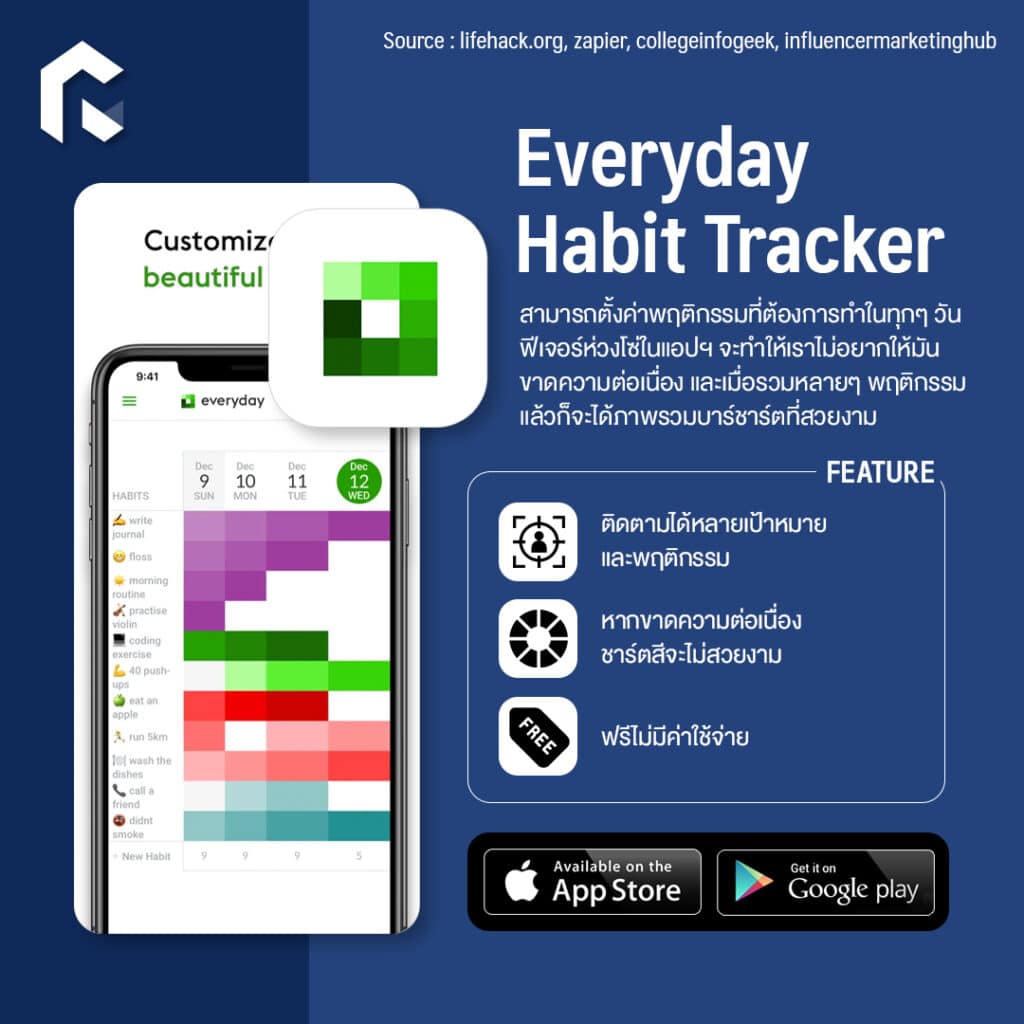 Everyday เป็นแอปฯ ติดตามพฤติกรรมที่ใช้งานง่าย ฟีเจอร์ไม่เยอะ แต่เพียงพอแล้วสำหรับการปรับพฤติกรรมและจัดระเบียบชีวิต เพราะเราสามารถตั้งค่าพฤติกรรมที่ต้องการทำในทุกๆ วัน ฟีเจอร์ห่วงโซ่ในแอปฯ ทำให้เราไม่อยากให้มันขาดความต่อเนื่อง และเมื่อรวมหลายๆ พฤติกรรมแล้วก็จะได้ภาพรวมบาร์ชาร์ตที่สวยงาม