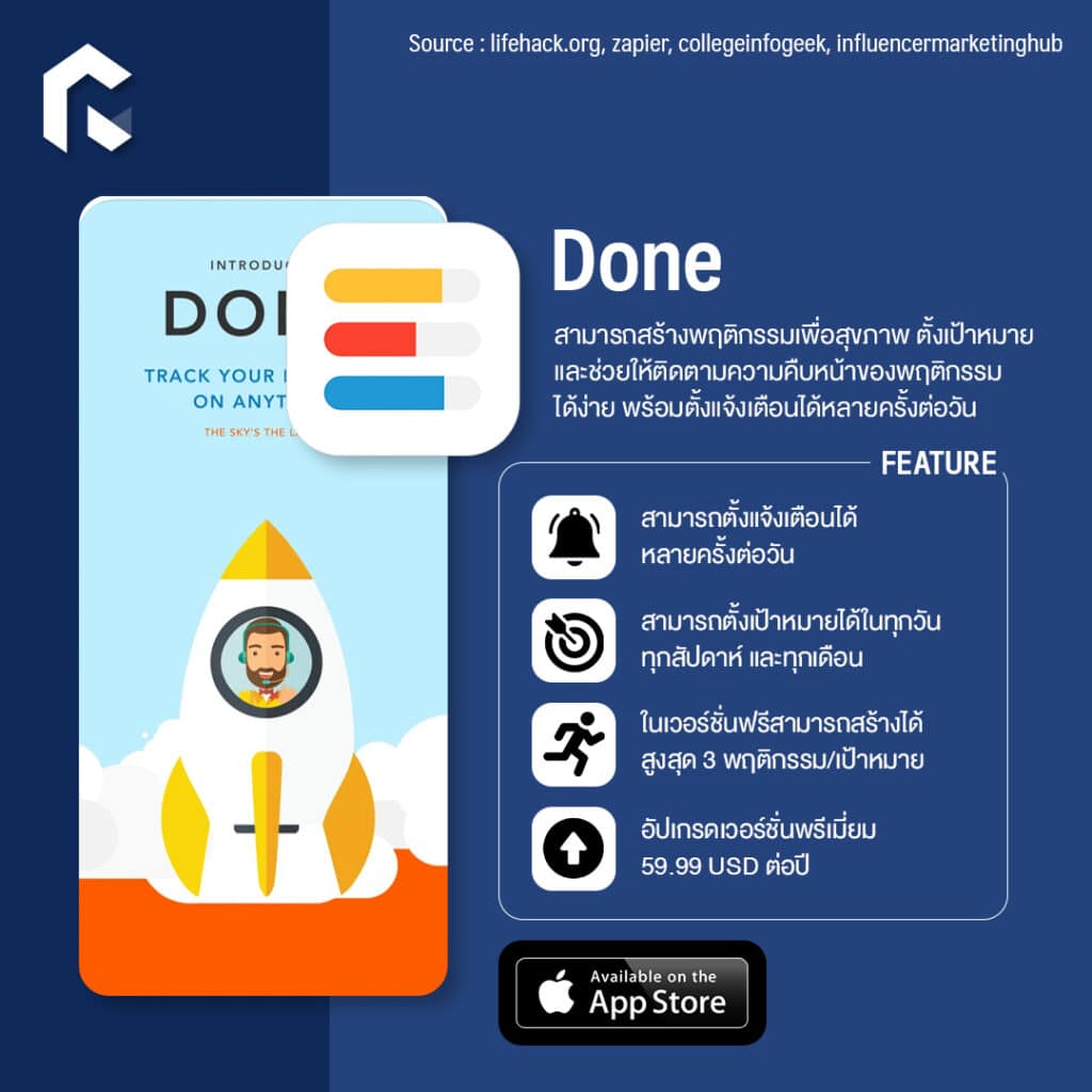 ภายในแอปฯ Done เราจะสามารถสร้างพฤติกรรมเพื่อสุขภาพ ตั้งเป้าหมาย และช่วยให้ติดตามความคืบหน้าของพฤติกรรมได้ง่าย พร้อมตั้งแจ้งเตือนได้หลายครั้งต่อวัน