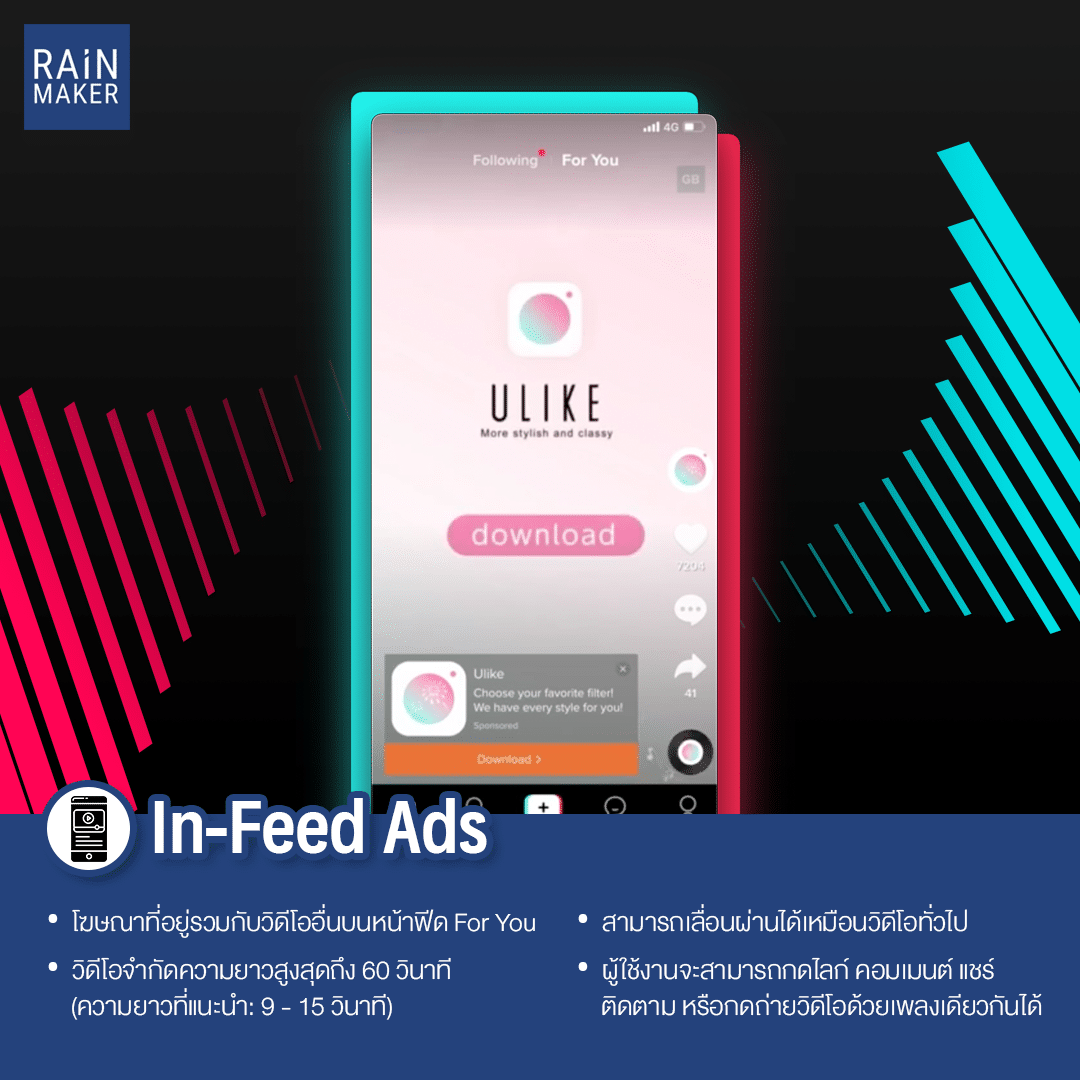 เป็นโฆษณาประเภทที่พบบ่อยเช่นกัน เมื่อผู้ใช้งานไถหน้าฟีดอยู่ในหน้า For You ก็จะเจอโฆษณาแทรกเข้ามาอยู่บ้าง ปนไปกับคอนเทนต์ทั่วไปบนหน้าฟีด เหมาะกับโฆษณาหรือแบรนด์ที่ต้องการเล่าเรื่องในมุมมองแบบครีเอเตอร์ทั่วไปบน TikTok หรือพวกคอนเทนต์รีวิว เป็นต้น
