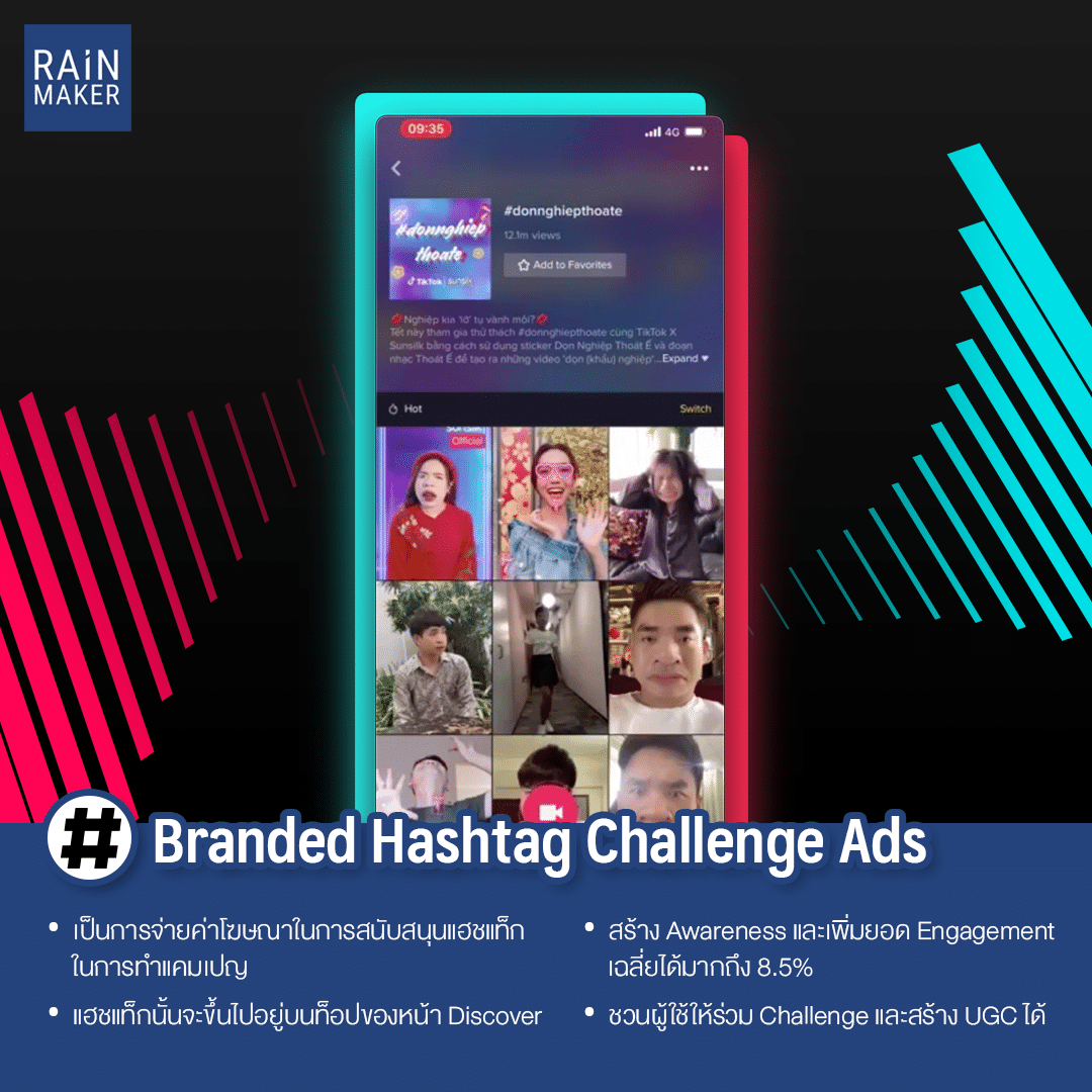 เป็นการให้การสนับสนุนแฮชแท็ก ที่จะทำให้แฮชแท็กนั้นขึ้นไปอยู่บนท็อปของหน้า Discover นับเป็นการโฆษณาอีกหนึ่งประเภทที่เรียกยอด Engagement ได้ไม่น้อย เนื่องจากคอนเทนต์ส่วนใหญ่จะเป็นแนวดึงดูด เชิญชวนให้ผู้ใช้งานมาร่วมสร้างสรรค์หรือแสดงออกถึงอะไรบางอย่างเป็นแคมเปญ และสามารถรวบรวมคอนเทนต์ UGC (User Generated Content) ไว้ในแฮชแท็กบนหน้า Challenge ได้อีกด้วย
