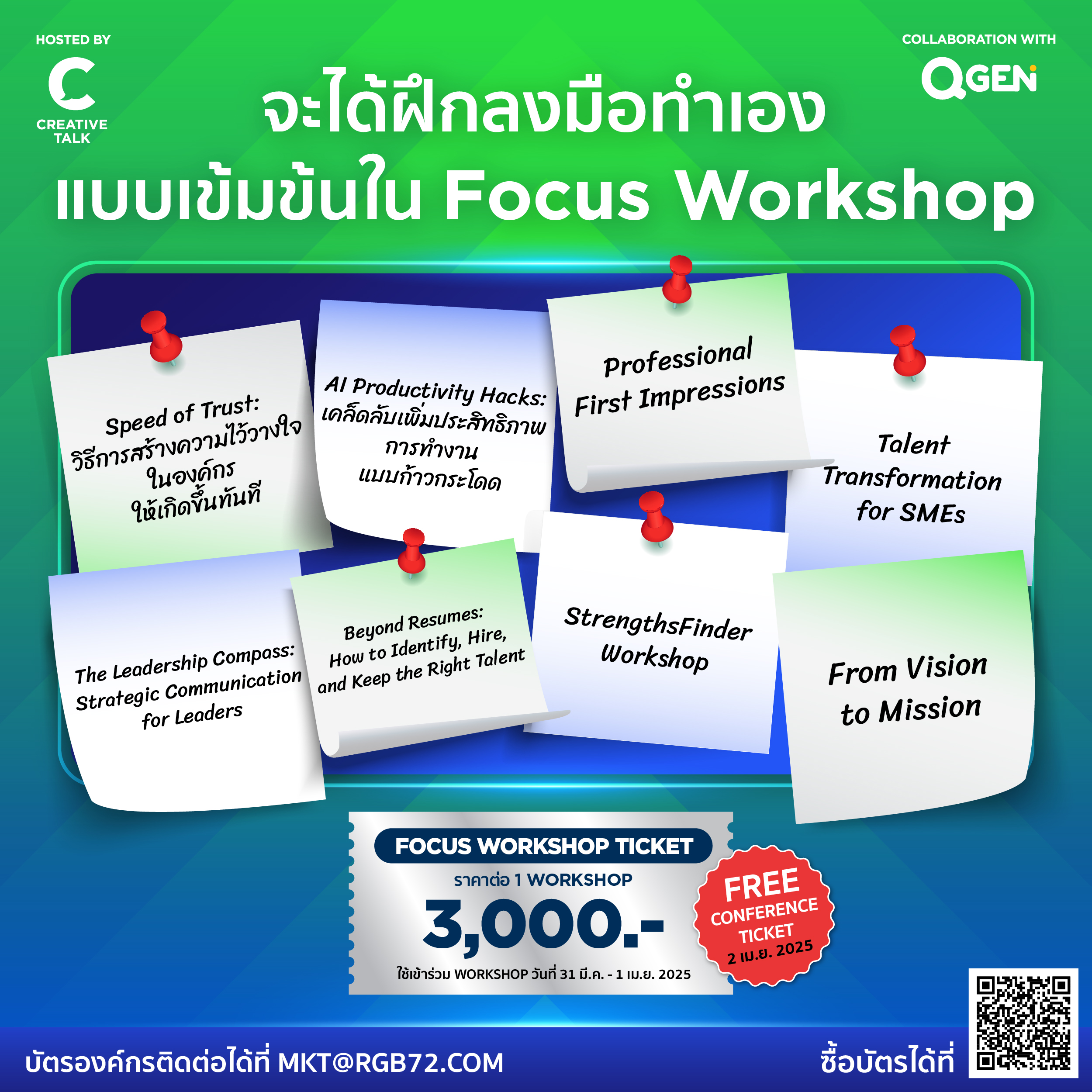 เตรียมพบกับ Focus Workshops สุดเข้มข้น ที่จะจัดในวันที่ 31 มี.ค. – 1 เม.ย. 2025 จากวิทยากรผู้มากประสบการณ์เจาะเนื้อหาเข้มข้นตลอด 3 ชม. ต่อ 1 Workshop พร้อมเอกสารหรือไฟล์ประกอบการเรียน การสอน และอาหารว่าง