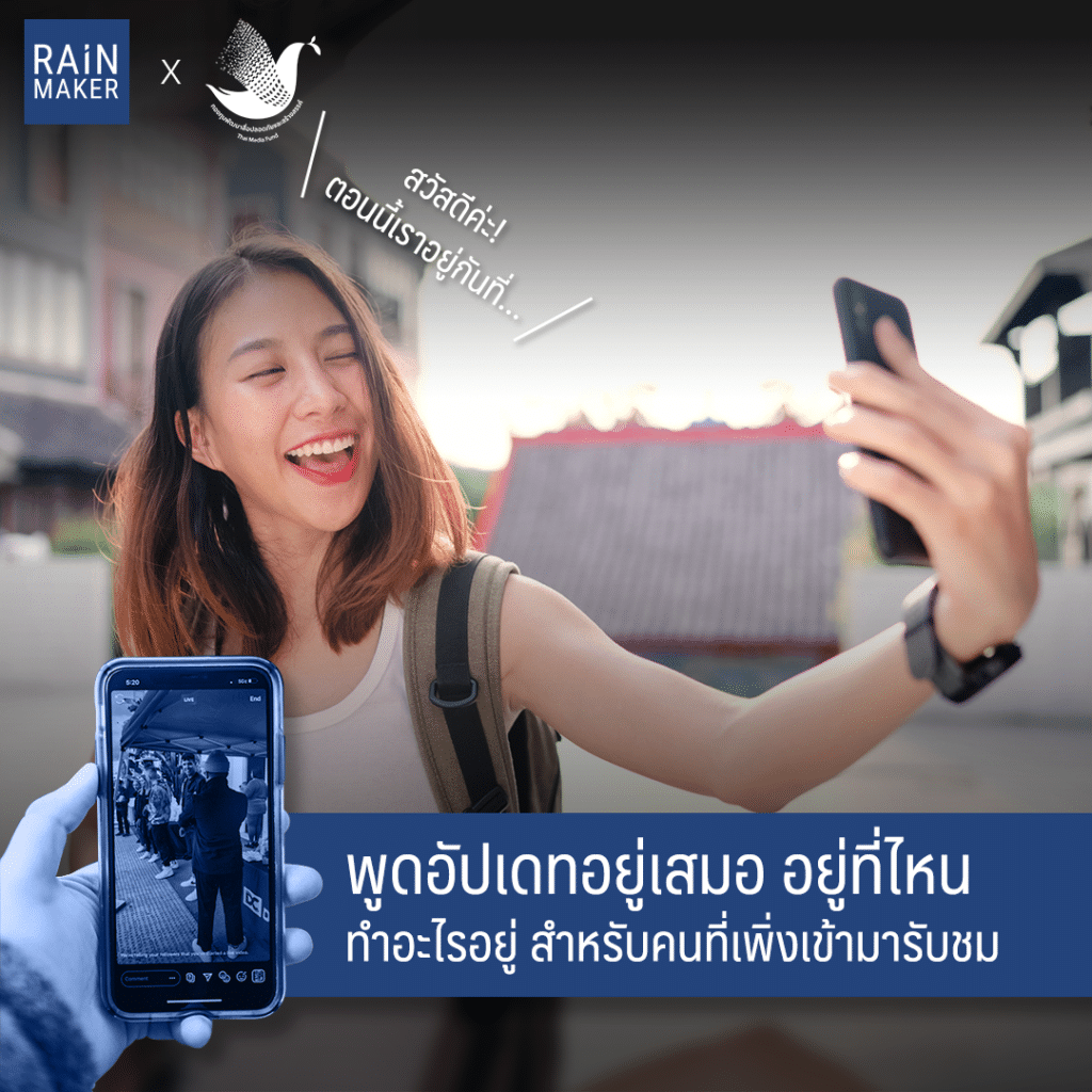 เป็นเทคนิคที่หลายคนอาจมองข้าม แต่ระหว่างการไลฟ์แน่นอนว่าต้องมีผู้ชมใหม่ๆ เข้ามาเรื่อยๆ คุณจึงจำเป็นต้องอัปเดทอยู่เสมอว่า ตอนนี้เราอยู่ที่ไหน กำลังพาชมหรือดู งานหรือสถานที่อะไรอยู่ ซึ่งอาจจะพูดตอนระหว่างเดินอยู่ก็ได้ เพื่อป้องกันการเกิด Dead Air ค่ะ
