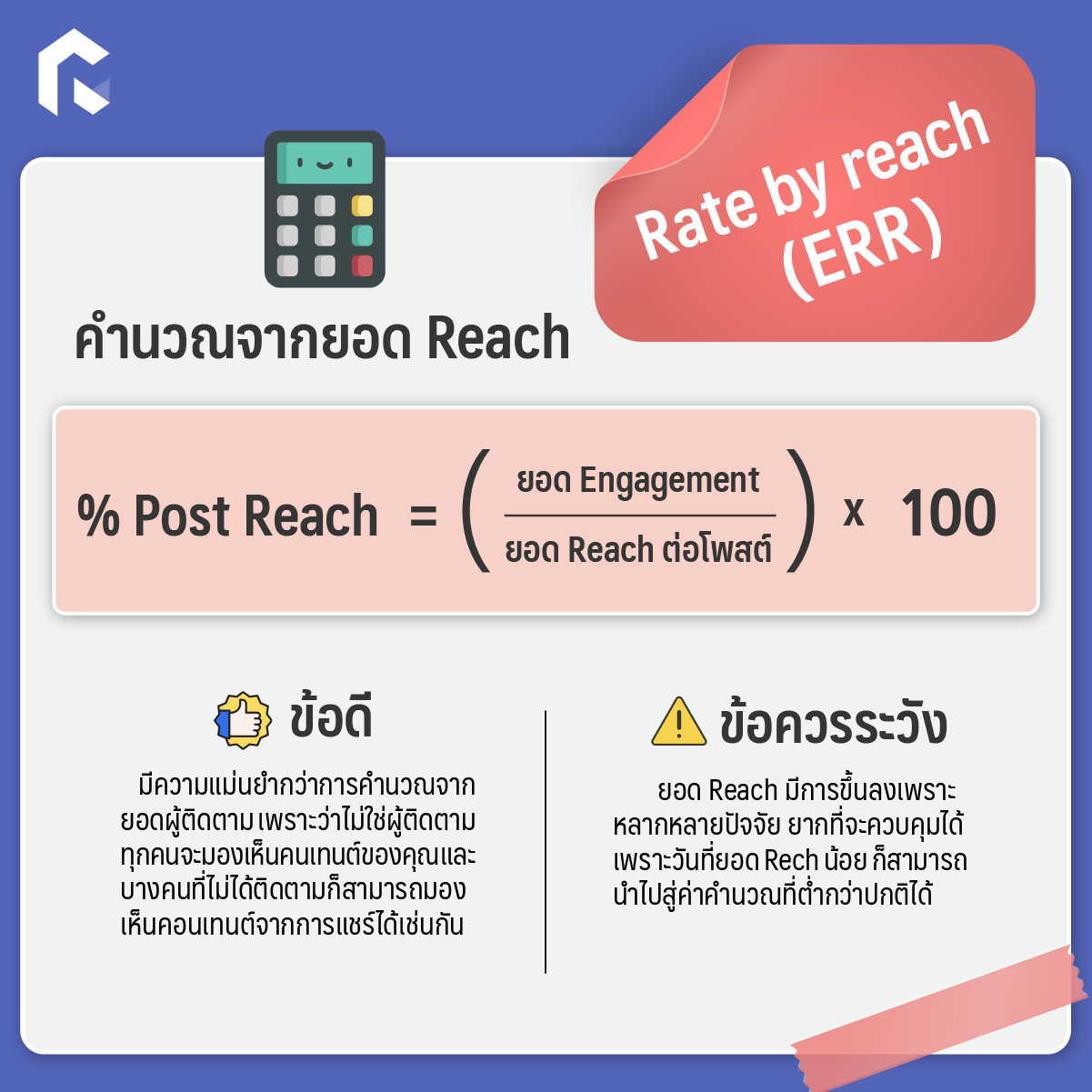 ข้อควรระวัง: ยอด Reach มีการขึ้นลงเพราะหลากหลายปัจจัย เลยทำให้ยากที่จะควบคุมได้ เพราะวันที่ยอด Rech น้อย ก็สามารถนำไปสู่ค่าคำนวณที่ต่ำกว่าปกติได้