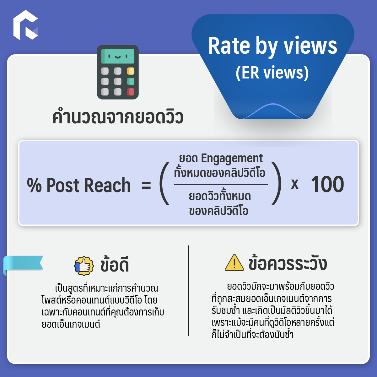 ข้อดี: เป็นสูตรที่เหมาะแก่การคำนวณโพสต์หรือคอนเทนต์แบบวิดีโอ โดยเฉพาะกับคอนเทนต์ที่คุณต้องการเก็บยอดเอ็นเกจเมนต์