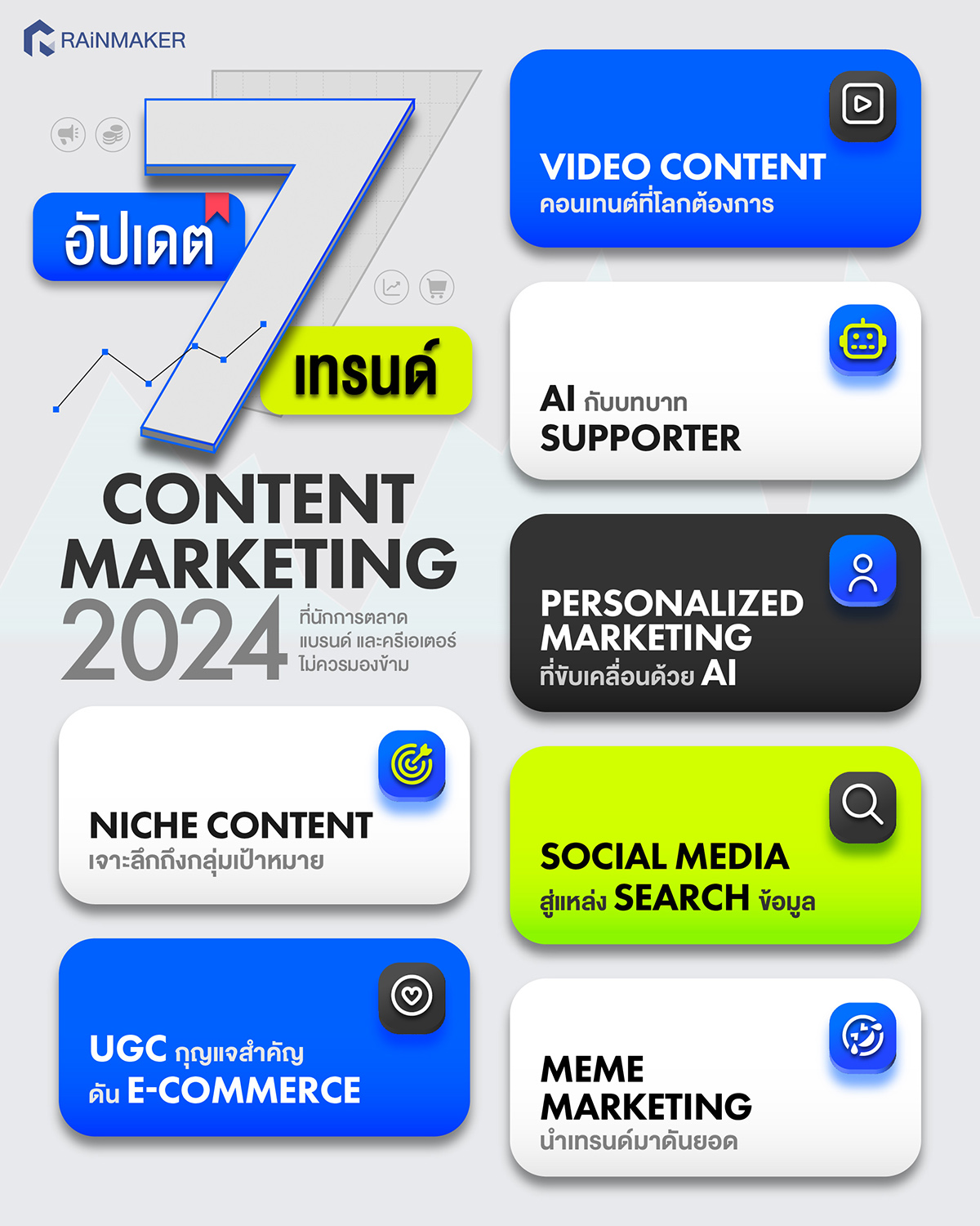 ในวันนี้ RAiNMaker เลยอยากชวนทุกคนมาอัปเดตเทรนด์ Content Marketing ประจำปี 2024 เพื่อให้นำอัปเดตต่าง ๆ ไปประยุกต์ใช้ในการสร้างสรรค์คอนเทนต์และปรับกลยุทธ์การตลาดให้ทันเทรนด์กัน!