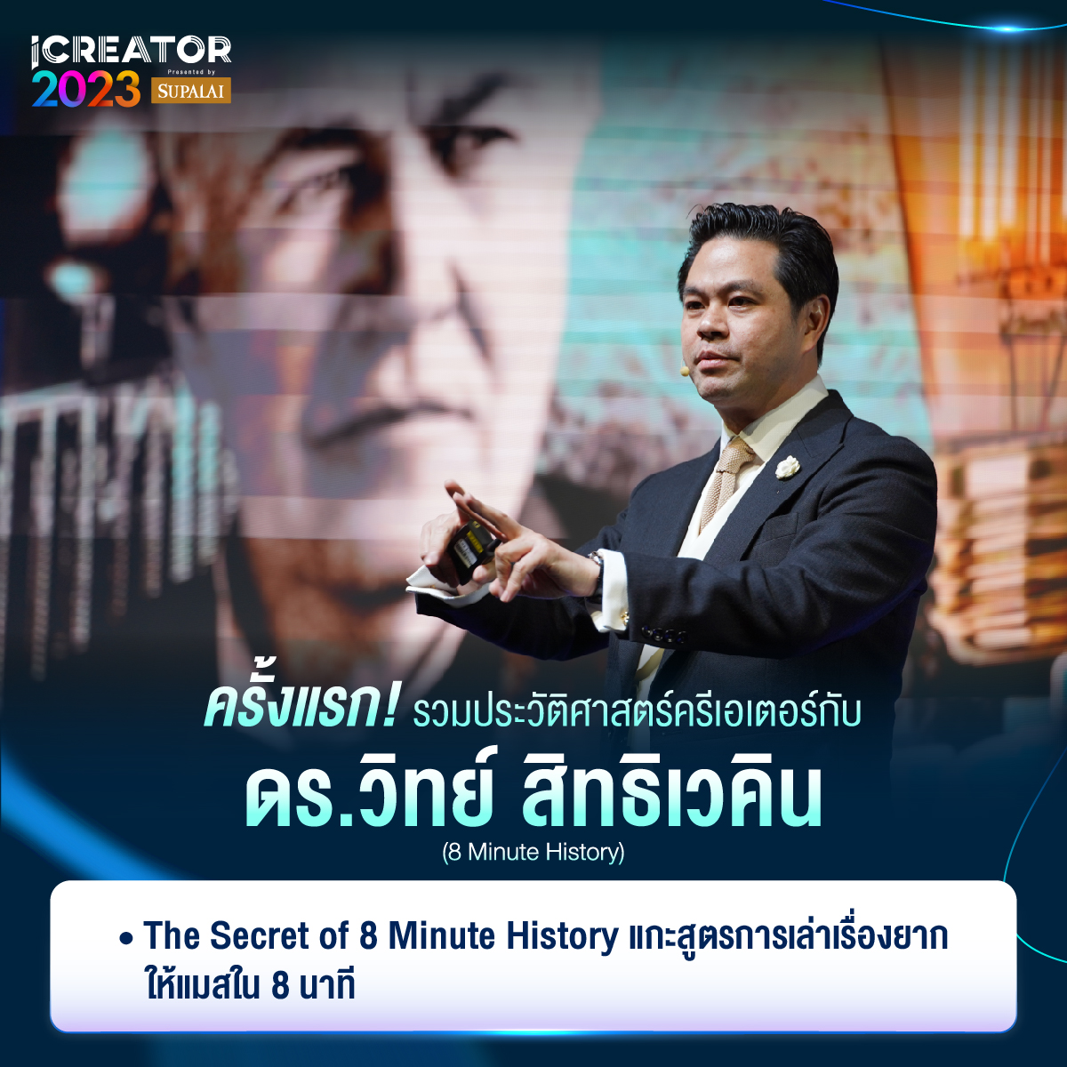 เพราะงาน iCreator Conference 2023 เป็นงานที่รวมตัวเหล่าคนในวงการคอนเทนต์ครีเอเตอร์ที่ใหญ่ที่สุดในไทย เราจึงจัดเซสชันที่จะพาทุกคนย้อนกลับไปมองประวัติศาสตร์การเป็นครีเอเตอร์กันบ้าง และบุคคลผู้เล่าเรื่องประวัติศาสตร์ให้เป็นเรื่องสนุกได้ก็ไม่ใช่ใครที่ไหน โดย ดร.วิทย์ สิทธิเวคิน ก็รวมประวัติศาสตร์ครีเอเตอร์มาเล่าได้อย่างน่าสนใจ เสมือนท่องเวลาไปอยู่ในแต่ละยุคได้เป็นอย่างดี