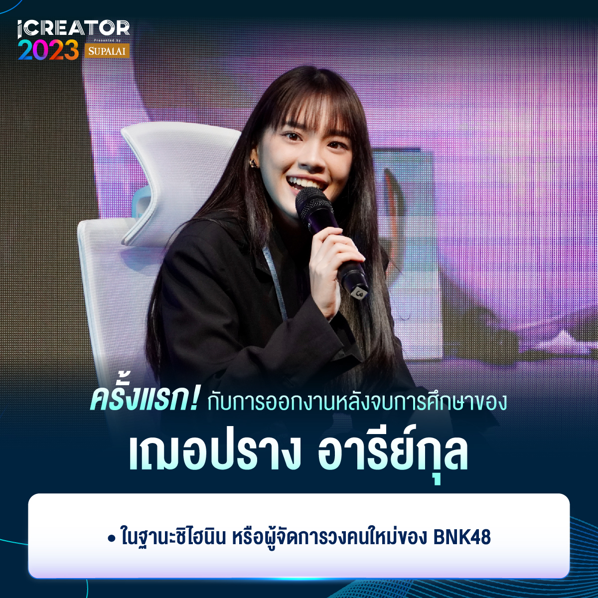 แม้เฌอปราง อารีย์กุล จะถูกจดจำในฐานะเมมเบอร์ของ BNK48 แต่บทบาทสำคัญที่เฌอปรางได้เริ่มต้นก้าวเดินใหม่ปีนี้ก็มีหลาย ๆ คนอยากรู้แน่นอน ว่าในฐานะชิไฮนิน หรือผู้จัดการวงคนใหม่ของ BNK48 มีมุมมองต่อวงการ T-Pop ในประเทศไทยอย่างไร เพราะนับว่าเป็นปีที่กระแส T-Pop และ T-Rap ต่างก็เติบโตขึ้นมาก และแน่นอนว่างาน iCreator Conference 2023 ก็เป็นงานแรกที่เฌอปรางได้มาปรากฎตัวในฐานะชิไฮนินเลย