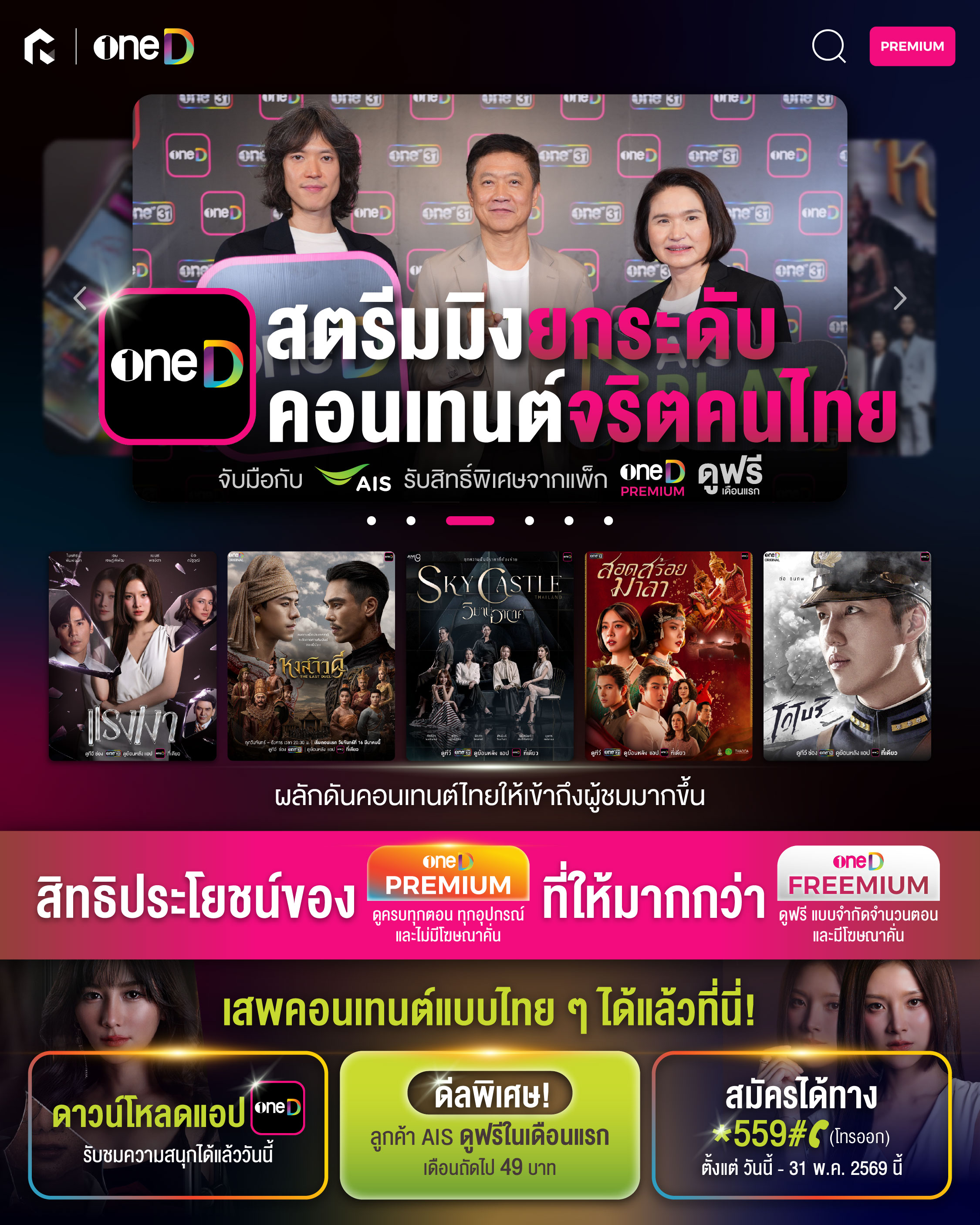 แฟนคลับคอนเทนต์ไทยห้ามพลาด! กับแอป oneD สตรีมมิงไทยที่พร้อมยกระดับการรับชมคอนเทนต์ที่ ‘เข้าใจจริตคนไทย’ เพื่อส่งเสริมให้คนไทยสนุกกับคอนเทนต์ไทย ทั้งละคร – ซีรีส์ไทยอย่างครบรส ผ่านแพ็กเกจ ‘oneD PREMIUM’ และดีลสุดพิเศษสำหรับลูกค้า AIS “ดูฟรีเดือนแรก เดือนถัดไปเพียงเดือนละ 49 บาท”