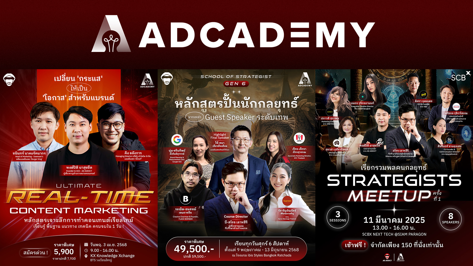 - School of Strategist รุ่นที่ 6 – หลักสูตรระยะสั้นปั้นนักกลยุทธ์มืออาชีพใน 6 สัปดาห์ ที่จัดมาอย่างต่อเนื่องจนเข้าสู่รุ่นที่ 6 อย่างรวดเร็ว (ดูรายละเอียดเพิ่มเติมได้ที่ : https://bit.ly/ADcademySOS6)