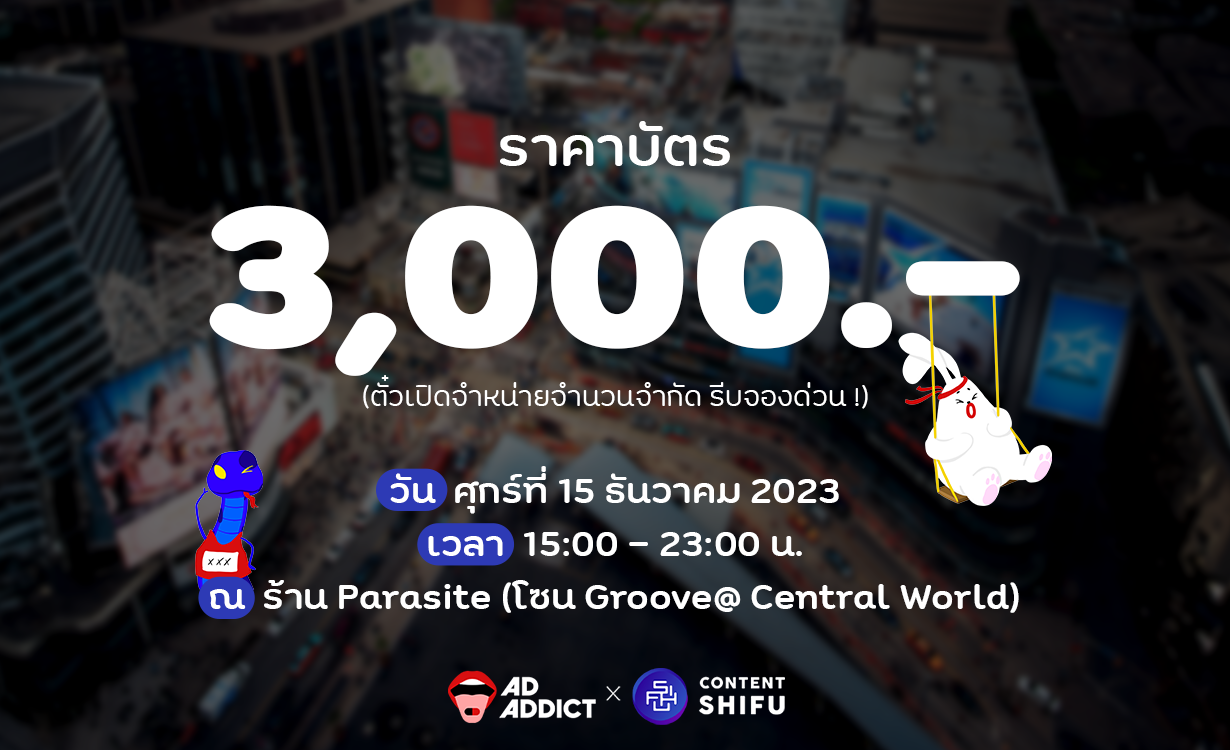 ที่จะพาเหล่านักการตลาด คนโฆษณา และชาวเอเจนซี รับบทเป็น “กระต่าย” ตัวแทนปี 2023 ที่กำลังวิ่งเข้าเส้นชัยเพื่อกลายร่างเป็นงูใหญ่ต้อนรับปี 2024 ได้อย่างแข็งแกร่ง ! 🐇➡️🐍 ผ่านคอนเซปต์ 3Ns ที่มีครบทั้งสาระ ความรู้ และความบ้าแบบเกินพิกัด !