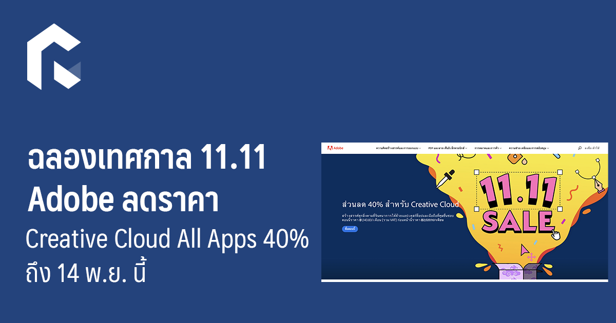 Adobe ปล่อยดีลสุดคุ้ม ต้อนรับเทศกาล 11.11 โดยลดราคา Creative Cloud All Apps ถึง 40% จากเดิมราคา 2,020.16 ต่อเดือน เหลือเพียง 1,143.83 ต่อเดือนเท่านั้น สามารถซื้อได้ตั้งแต่วันนี้ถึงวันที่ 14 พ.ย. นี้เท่านั้น