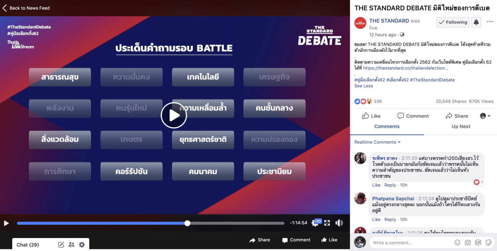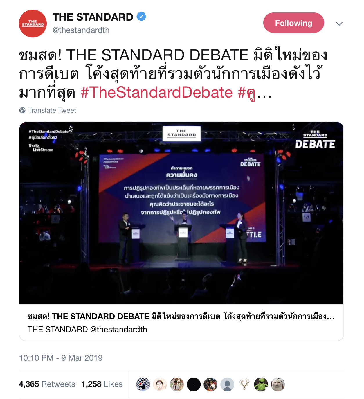 นั่นหมายความว่าทาง The Standard มีทีม Live และทีมอัพคอนเทนต์แยกกัน เลือกประเด็นมาลงบนออนไลน์ได้เลยทันที และตอนท้ายยังมีการตัดคลิปที่เป็น Aftermatch หรือหลังการดีเบตมาให้ชมด้วย