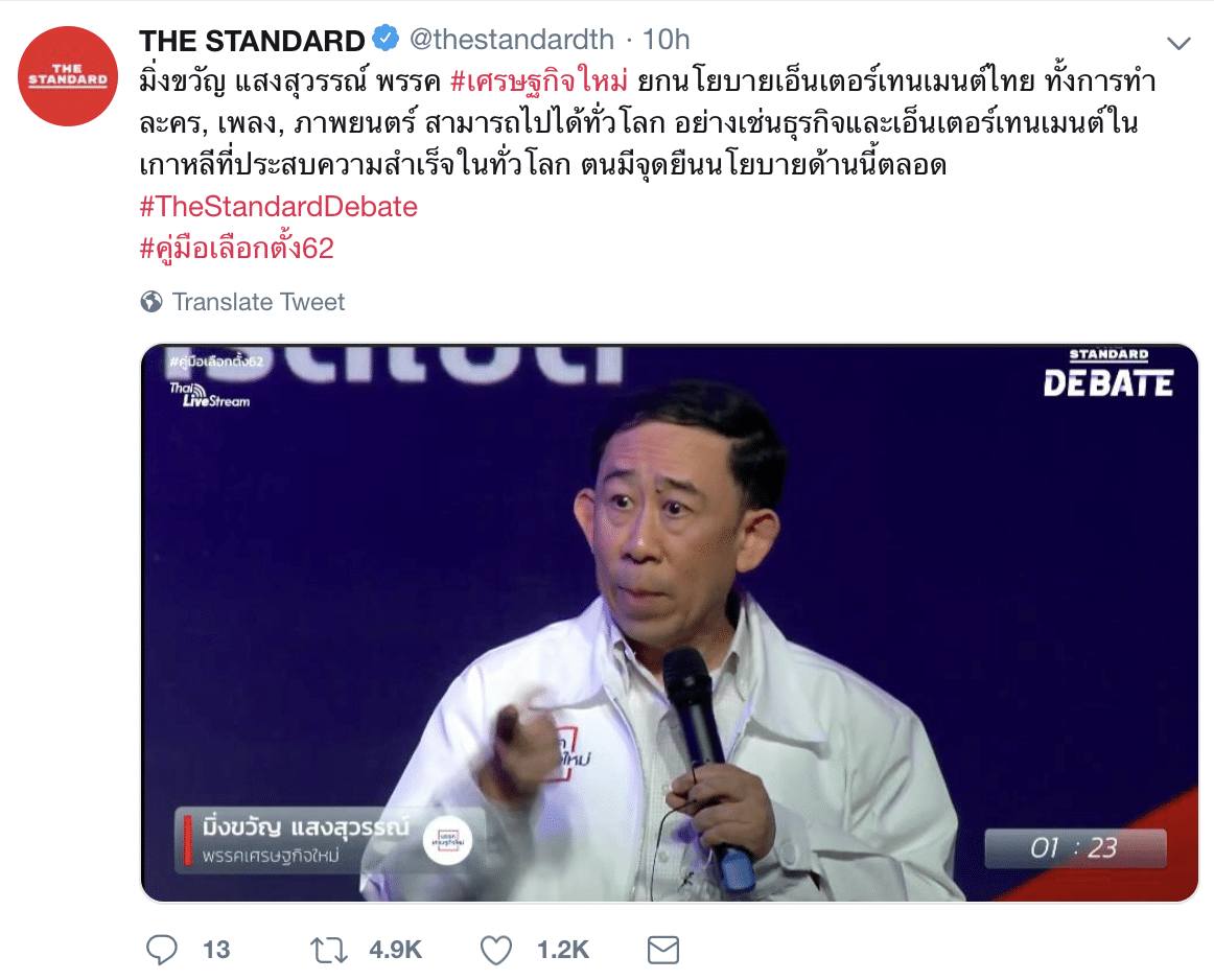 ในขณะที่คอนเทนต์ที่น่าจะเหมาะสมกับทวิตเตอร์มาก ๆ (ซึ่งหลายคนก็พอจะเดาออกอยู่แล้ว) คือการแคปจอ แล้วพิมพ์ประเด็นสิ่งที่คนคนนั้นกำลังพูด พร้อมติด #TheStandardDebate ซึ่งทาง The Standard ก็ทำออกมาเป็นะระยะ ๆ ตลอดการดีเบต อันที่คนรีเยอะที่สุดก็คือ คุณมิ่งขวัญ ที่พูดเรื่องนโยบายเอ็นเตอร์เทนเมนต์ ตามมาด้วยเรื่องของคุณธนาธร #ฟ้ารักพ่อ