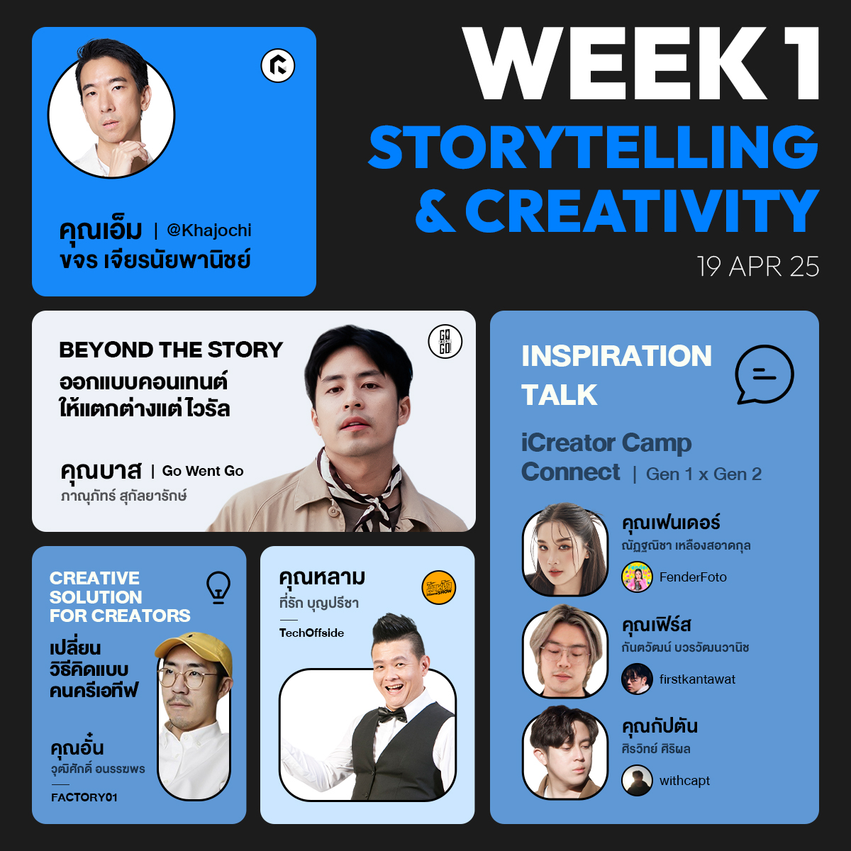 เริ่มต้นกันที่สัปดาห์แรก “Storytelling & Creativity” ที่จะพาทุกคนไปอัปเดตภาพรวมและเทรนด์การทำคอนเทนต์ พร้อมกับเทคนิคการวาง Storytelling ให้แตกต่าง รวมถึงวิธีประยุกต์แนวคิดแบบครีเอทีฟกับอาชีพครีเอเตอร์ นอกจากนี้ยังมีเซสชันพิเศษที่เชิญเหล่าผู้ชนะ Top 3 จาก iCreator Camp Gen 1 มาแลกเปลี่ยนประสบการณ์การเข้าร่วมแคมป์ และเส้นทางการเป็นครีเอเตอร์ของแต่ละคน
