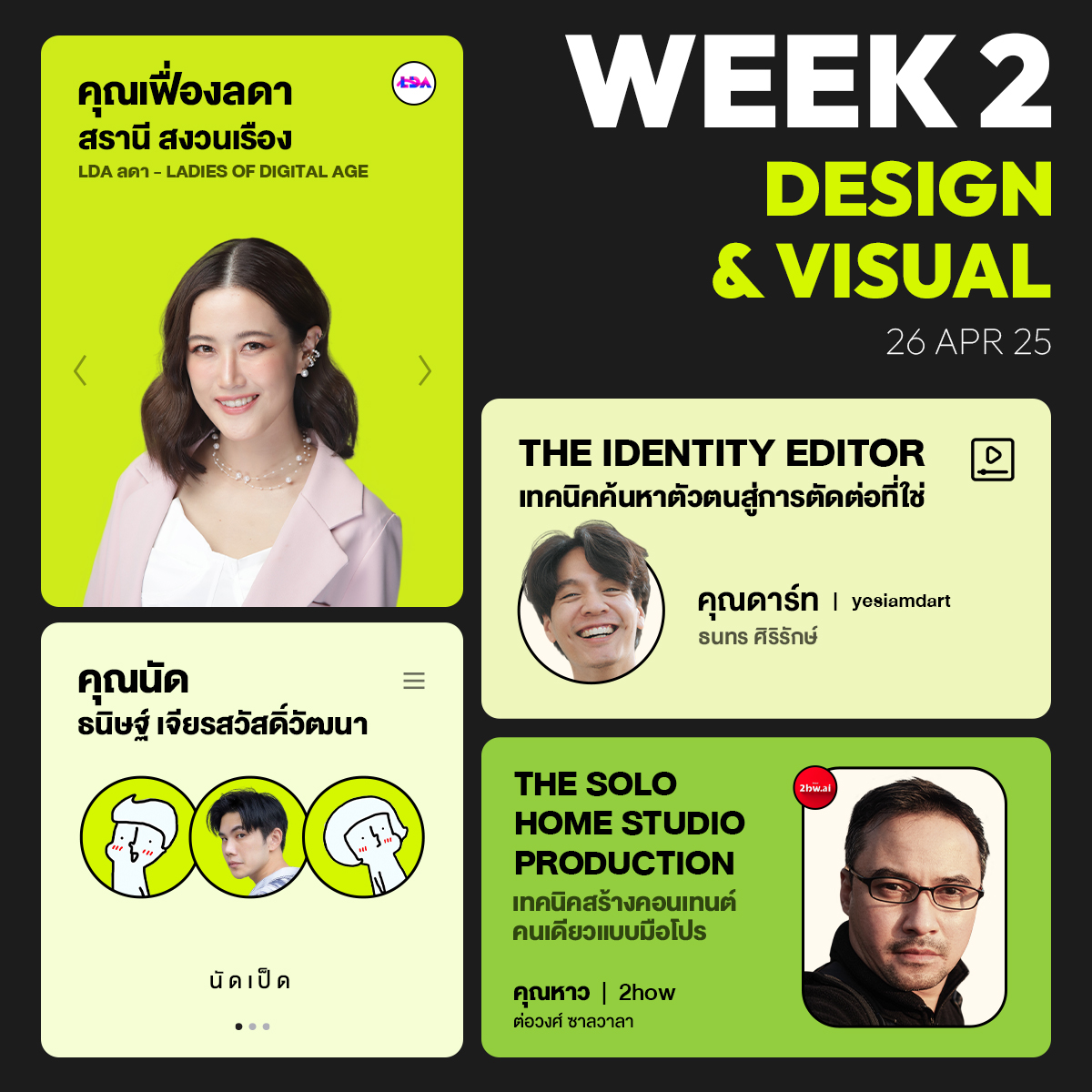 ต่อกันด้วยสัปดาห์ที่สองกับ “Design & Visual” ที่จะพาทุกคนไปค้นหาตัวตนผ่านการสร้างสรรค์ผลงานด้านภาพและวิดีโอ รวมถึงแนวทางการต่อยอดคอนเทนต์เหล่านั้นสู่คอนเทนต์ขั้นเหนือกว่าที่สามารถสร้างรายได้ได้ด้วย ผ่านการยกระดับทั้งสไตล์การออกแบบ และการตัดต่อที่สร้าง Branding ให้ตัวเองในตลาด