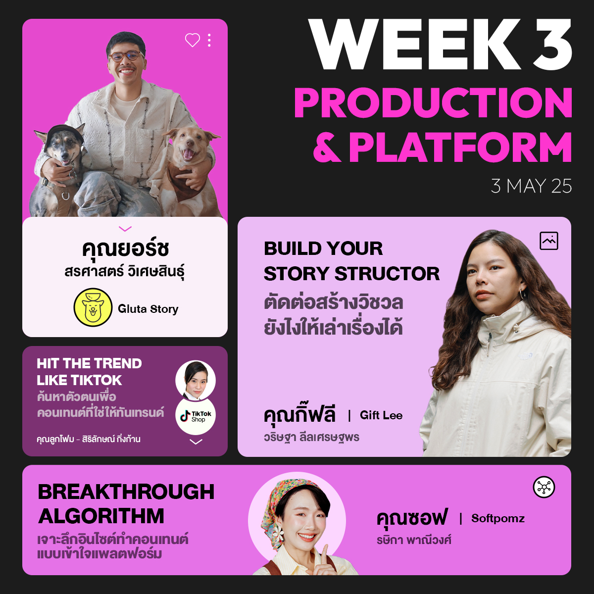 จบเรื่อง Design & Visual กันแล้ว ก็มาต่อด้วยสัปดาห์ที่ 3 กับ “Production & Platform” ที่ครบเครื่องทั้งเรื่องราวในมุมมองของแพลตฟอร์ม และครีเอเตอร์ผู้เชี่ยวชาญด้านโปรดักชัน ให้ทุกคนได้เรียนรู้การเตรียมตัวทุกขั้นตอนตั้งแต่ Pre-Pro-Post โปรดักชัน รวมถึงการเข้าใจธรรมชาติการทำงานของหลังบ้านแต่ละแพลตฟอร์ม เพื่อวิเคราะห์ข้อมูลและนำมาปรับใช้ในการสร้างสรรค์คอนเทนต์