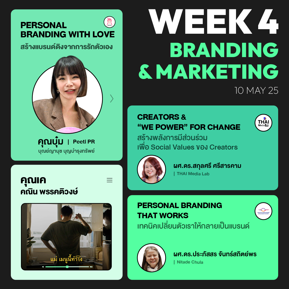สัปดาห์สุดท้ายของการ Lecture และ Workshop หลังจากที่ทุกคนเรียนรู้การทำคอนเทนต์ตั้งแต่การทำความเข้าใจแพลตฟอร์ม, การวางโครงเรื่อง Storytelling, การคิดแบบครีเอทีฟ, การออกแบบงานทั้งภาพและวิดีโอ รวมถึงโปรดักชันไปแล้ว ก็เตรียมพบกับเรื่องราวในหัวข้อ “Branding & Marketing” ที่เสริมสร้างความเข้าใจด้าน Marketing ให้กับครีเอเตอร์ทุกคน ผ่านการเรียนรู้วิธีการสร้าง Branding ของตัวเองให้ต่าง และต่อยอดสู่การทำงานกับแบรนด์