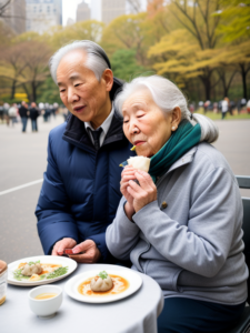 ซึ่ง Prompt ใหม่ที่ได้เป็นดังนี้ “In the Central Park, an ((old lady)) with long grey hair was eating dumplings with her (((husband))). The sun was setting, casting a warm glow on the couple as they enjoyed their meal. ((Old, grey-haired lady, husband, Central Park, dumplings, sun setting, warm glow))”