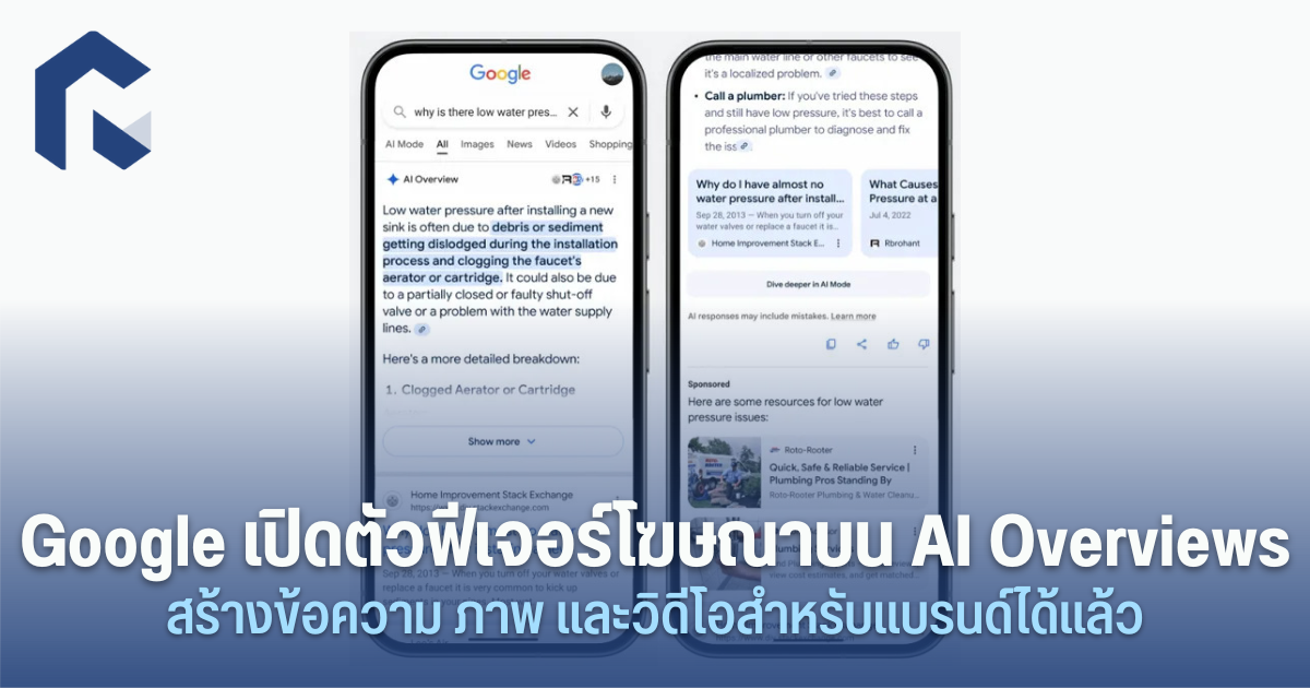 หนึ่งในไฮไลท์สำคัญที่ Google ได้ประกาศออกมาคือการทดสอบโฆษณาภายในฟีเจอร์ ‘AI Overviews’ โดยเป็นการแสดงโฆษณาที่ผสานเข้ากับคำตอบของ AI เพื่อเปิดโอกาสให้แบรนด์เชื่อมโยงกับกลุ่มเป้าหมายได้โดยตรง เช่นผู้ใช้ถามว่า ทำไมแอร์ถึงไม่ทำงานหลังจากติดตั้งใหม่ ระบบอาจให้คำแนะนำวิธีการแก้เบื้องต้น พร้อมแสดงโฆษณาเป็นช่างแอร์ที่สามารถติดต่อได้ทันที