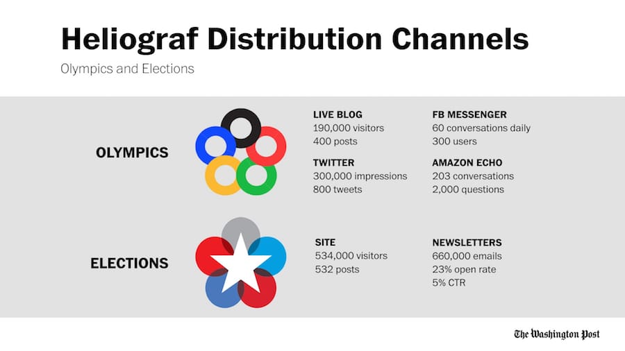 หลังจากที่มีผลงานในการรายงานข่าวโอลิมปิกแล้ว ทาง The Washington Post ก็ได้มีการนำ Heliograf มาใช้ในการเขียนข่าวแนวอื่น ๆ เพื่อทำการฝึกฝนมันให้สามารถเชื่อมโยงประเด็นต่าง ๆ ได้มากขึ้น Heliograf เข้ามามีบทบาทในการเขียนข่าวที่ซับซ้อนกว่าเดิม เช่น ข่าวเกี่ยวกับสภาสูงสหรัฐฯ (Congress) หรือการรายงานข่าวกีฬาในโรงเรียน (อเมริกาจะเน้นให้ความสำคัญกับข่าว Local News มาก เนื่องจากความกว้างใหญ่ไพศาลของมัน)