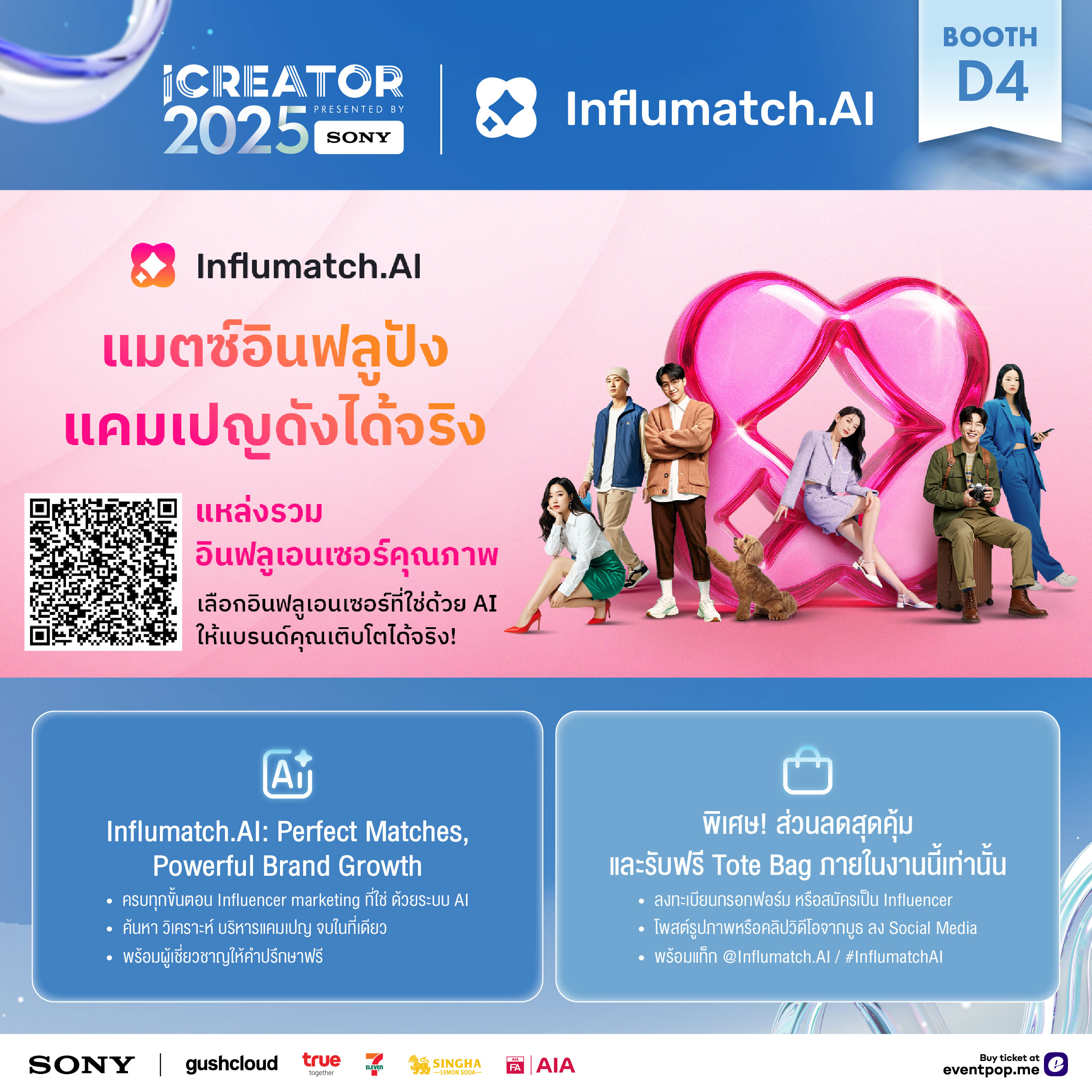 2. โพสต์รูปภาพหรือคลิปวิดีโอจากบูธ ลง Social Media พร้อมแท็ก @Influmatch.AI / #InflumatchAI