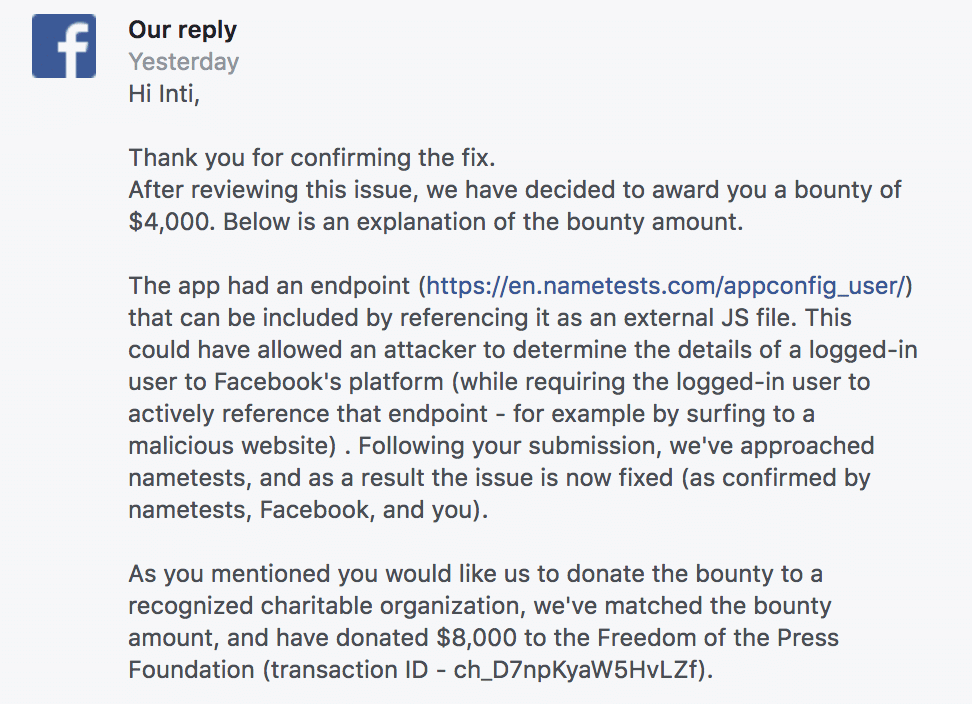 ในกรณีนี้คุณ De Ceukelaire ได้เขียน Blog ลงใน Medium ว่าในกรณีของ NameTests นี้เราจะเข้าถึงข้อมูลของผู้ใช้ได้อย่างไร ซึ่งนั่นเป็นหลังจากที่เขาแจ้งไปยัง Facebook ถึงปัญหานี้ และได้รับเงินรางวัล 4,000 เหรียญสหรัฐ (ก่อนที่เขาจะบอก Facebook ว่าให้เอาไปบริจากแทน และ Facebook ก็เพิ่มจำนวนเงินเป็นสองเท่าเพื่อเอาไปบริจาคการกุศล)