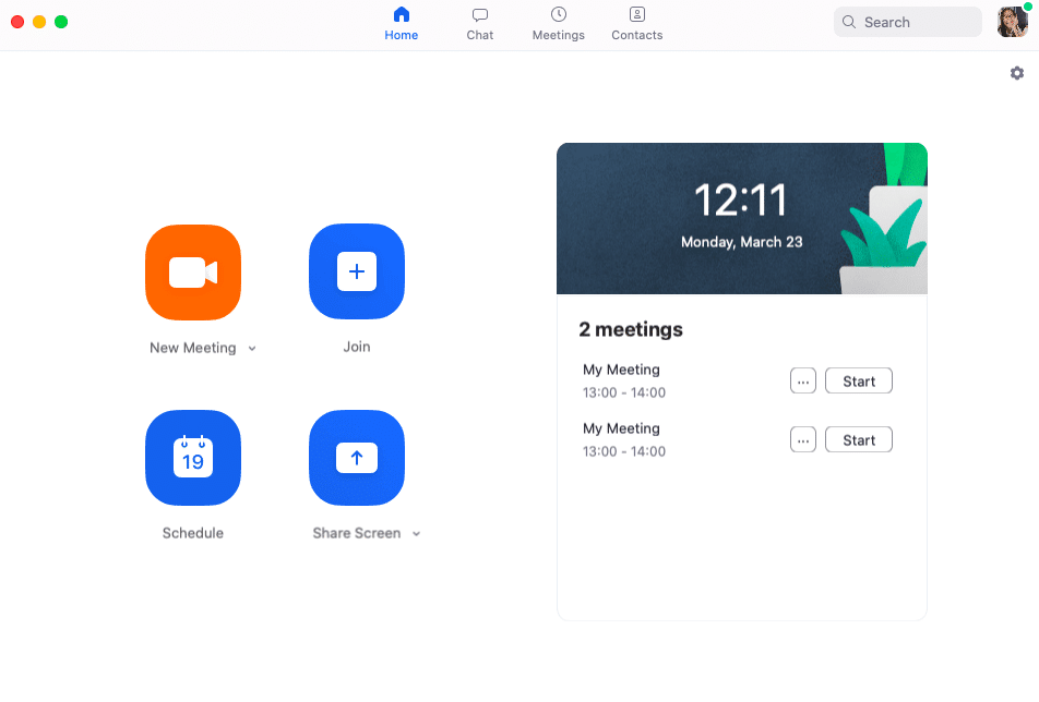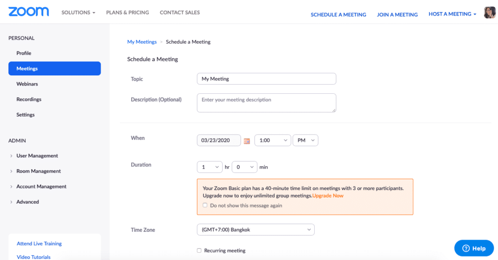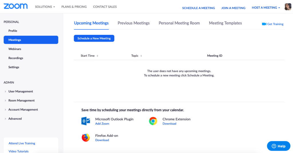3. เมื่อเข้ามาแล้วจะพบกับหน้านี้(ภาพด้านล่าง) จากนั้นหากต้องการเริ่มประชุม กดที่ Meetings > Schedule a New Meeting ได้เลยค่ะ