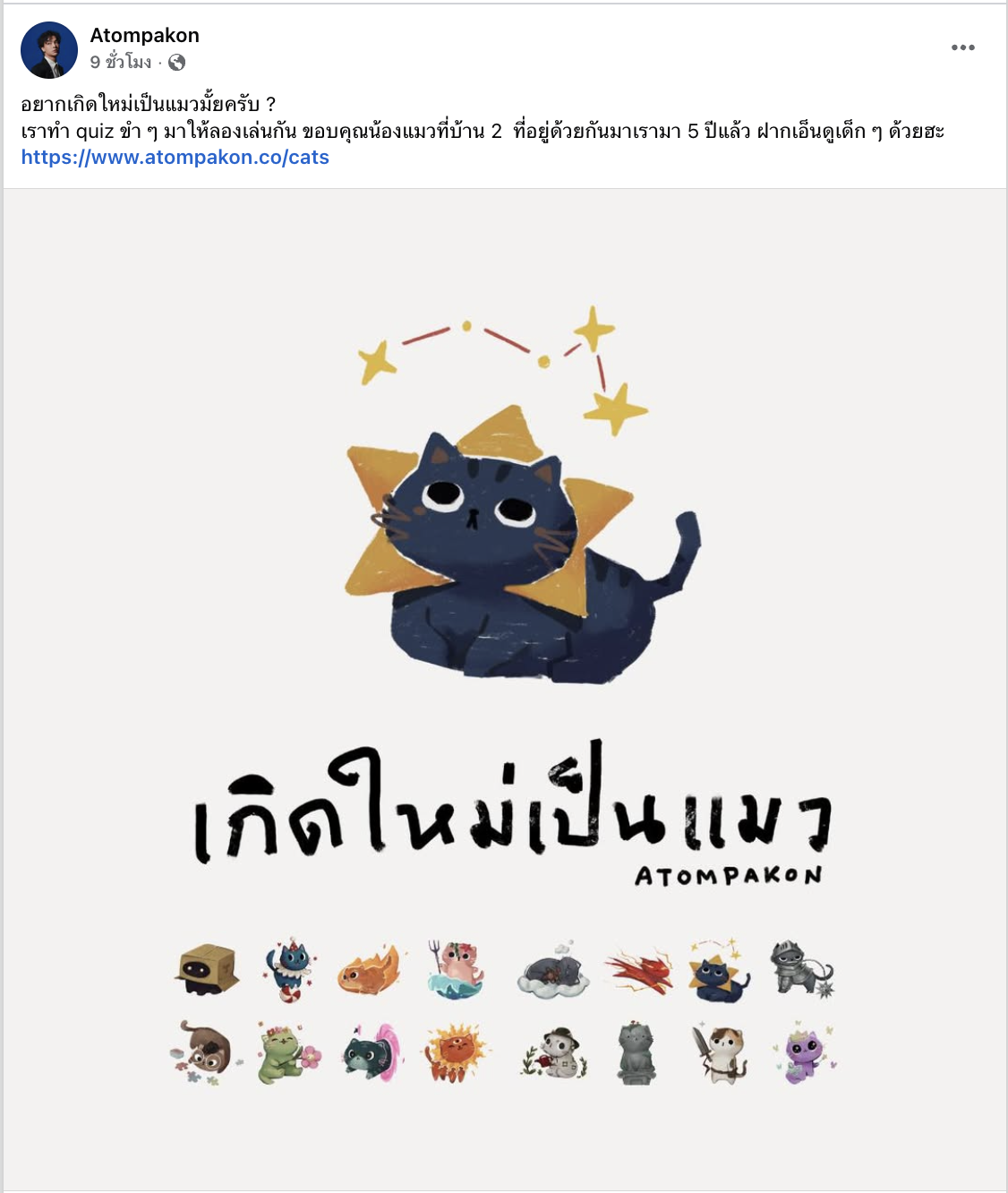 นอกจากนี้ Atompakon ยังโพสต์เชิญชวนให้ผู้ติดตามเข้าไปลองเล่นผ่านเว็บไซต์ ที่มาในคอนเซปต์สนุก เข้าใจง่าย และทิ้งท้ายด้วยเรื่องราวอบอุ่นของน้องแมวที่อยู่ด้วยกันมายาวนาน ซึ่งกลายเป็นแรงบันดาลใจหลักของโปรเจกต์นี้