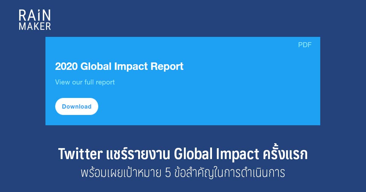 เมื่อวันที่ 7 เมษยน 2021 ที่ผ่านมา ทวิตเตอร์ได้แชร์รายงาน Global Impact ครั้งแรก เป็นตัวแทนของทางทวิตเตอร์ที่ได้ดำเนินการผ่านประเด็นต่างๆ ทั้งด้านสภาพแวดล้อม สังคม และการทำงานกับภาครัฐตั้งแต่ที่ก่อตั้งทวิตเตอร์มาตั้งแต่ปี 2006
