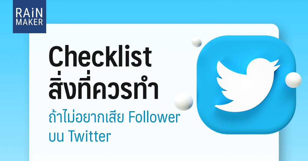 ยอด Follower ไม่ใช่ทั้งหมด แต่ก็เป็นค่านึงที่สามารถใช้วัดผลได้ว่าแอคเคานต์และคอนเทนต์ของเรามีการพัฒนาขึ้นหรือไม่ เพราะฉะนั้นการมียอดผู้ติดตามในจำนวนนึงที่อยู่กับเราก็นับจุดเริ่มต้นที่ดีในการจะต่อยอดทำกิจกรรมอื่นๆ ซึ่งหลายคนอาจกังวลว่าแล้วจะรักษายอด Follower บน Twitter ยังไงดีล่ะ วันนี้ RAiNMaker เลยทำ Checklist มาให้ทุกคนลองเช็กกันว่าเราได้ทำในสิ่งที่ควรทำเพื่อรักษายอดผู้ติดตามไว้หรือยัง มีอะไรบ้างไปรีบเช็กกันเลยดีกว่า!