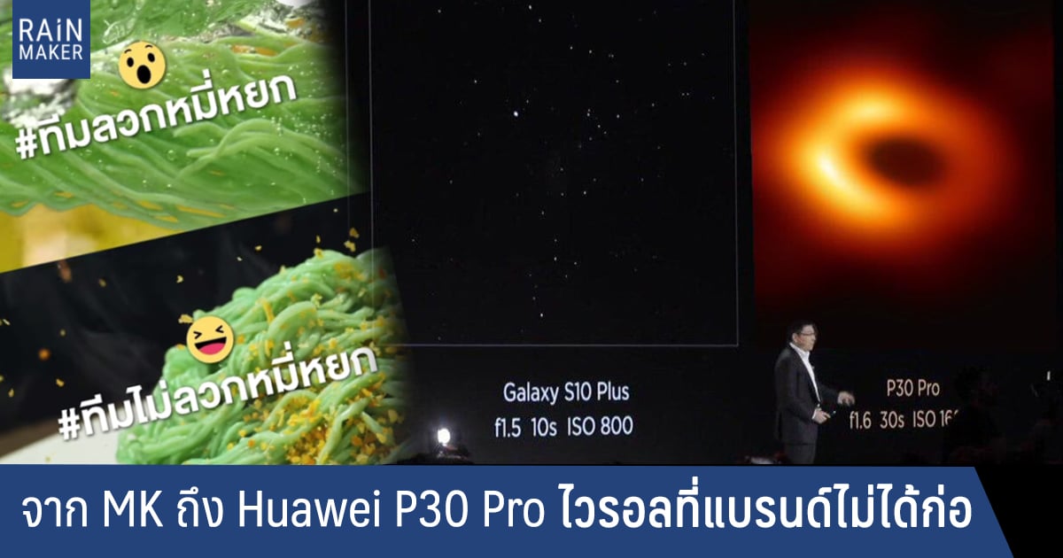กลายเป็นไวรอลระดับจักรวาลไปแล้วกับฟังก์ชั่นการซูม x50 เท่าของกล้องโทรศัพท์มือถือ Huawei P30 Pro ที่ทั่วโลกนำมาแซวว่าสามารถถ่ายหลุมดำได้ชัดกว่ากล้องโทรทรรศน์ของ NASA เสียอีก ซึ่งจะว่าไปก็ละม้ายคล้ายกับไวรอลหมี่หยก MK ก่อนหน้านี้ ที่เกิดจากการถกเถียงของชาวเน็ตมากว่าความตั้งใจของแบรนด์