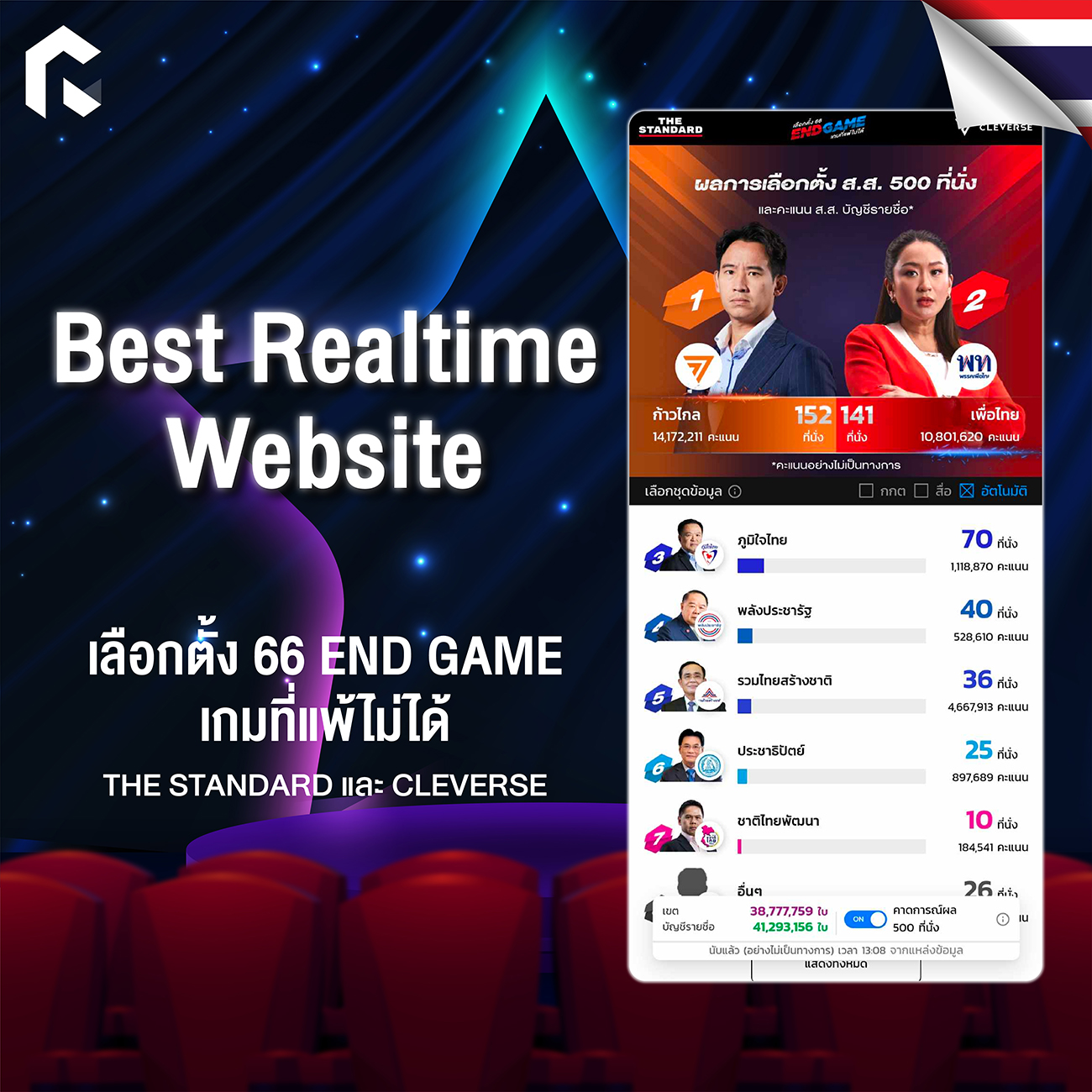 สำหรับเว็บไซต์ของ THE STANDARD และ CLEVERSE นับเป็นเว็บไซต์ที่มีอินเทอร์เฟซที่น่าจดจำที่สุดเลยก็ว่าได้ แม้จะใช้เวลาขึ้นหน้าโหลดนิดหน่อยก่อนเข้าหน้านับคะแนนแต่ ก็คุ้มค่ากับงานกราฟิกที่เก็บรายละเอียดได้ดีมาก ๆ เพราะระหว่างช่วงนับคะแนนเรียลไทม์ก็มีการเปรียบเทียบขึ้นหน้าแคนดิเดตประชันกันเหมือนไฟท์เตอร์อย่างชัดเจน โดยแบ่งเป็นสองฝั่งตามสีของพรรค